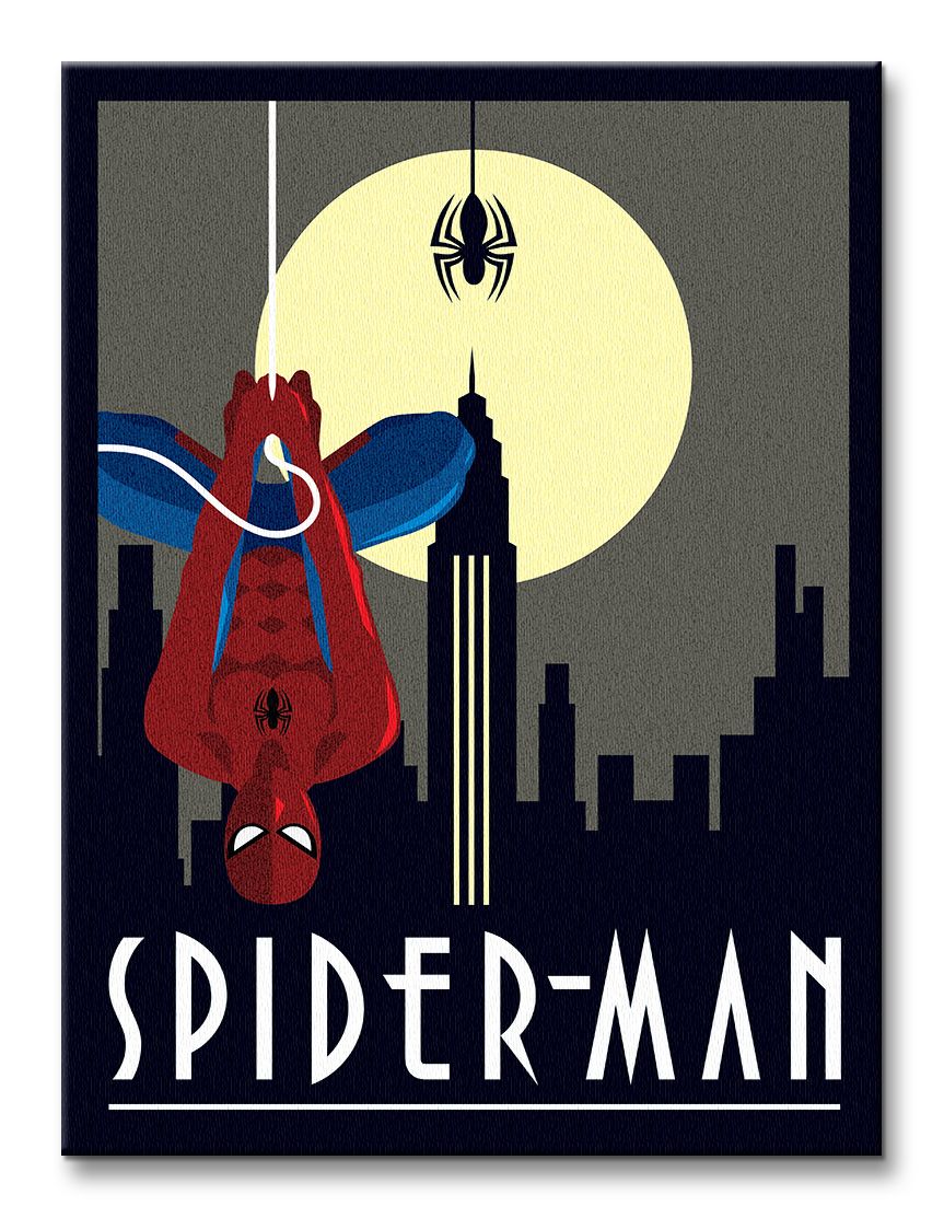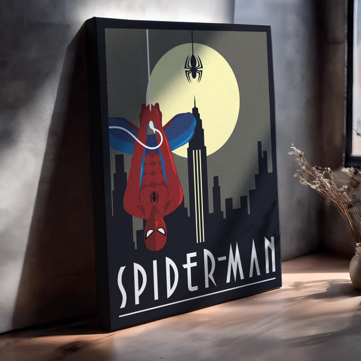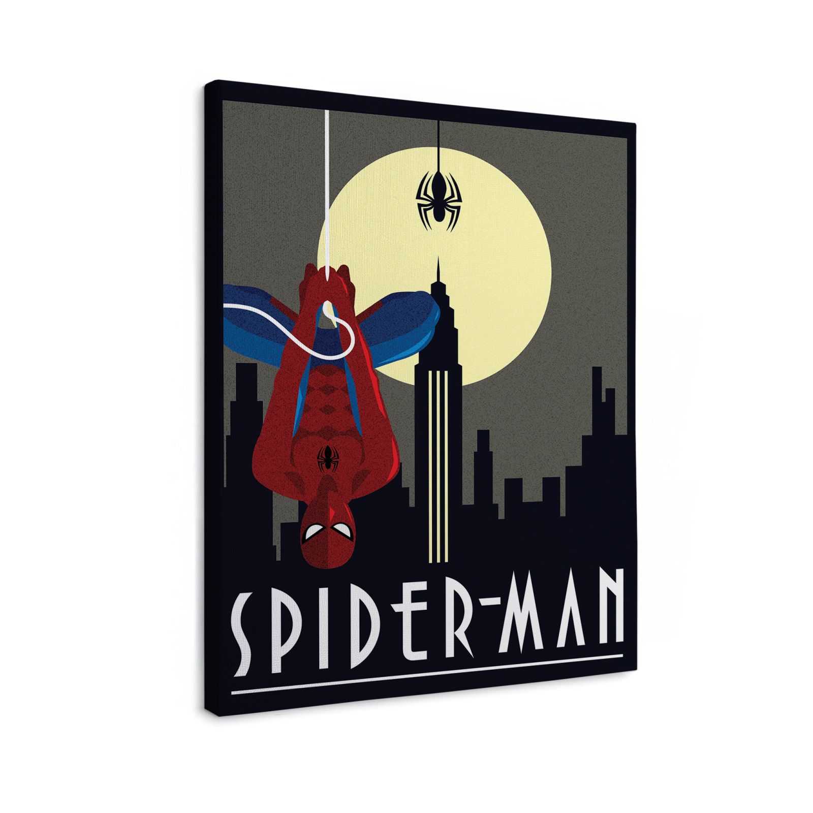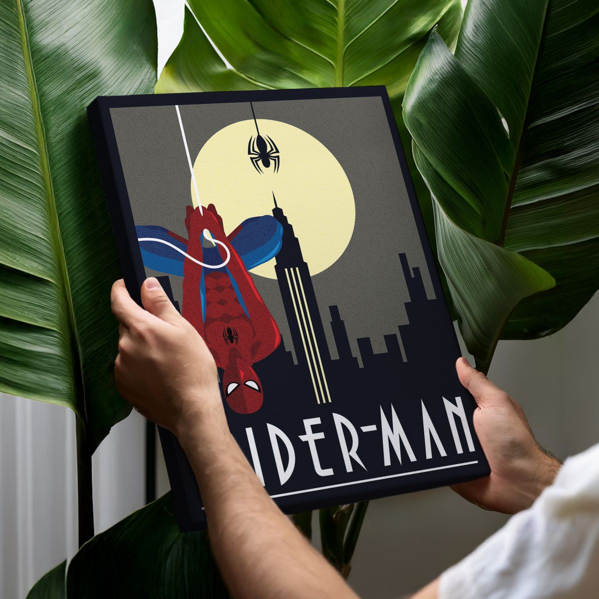 Obraz na ścianę noszący nazwę Marvel Deco (Spider-man Hanging). Autorstwa: nieznanego Szukasz oryginalnej, ekskluzywnej dekoracji na ścianę? Ten obraz jest dla Ciebie! fantastyczne kolory i rewelacyjna ostrość., obrazy charakteryzuje wysokie nasycenie barw i ostrość, nie sposób oderwać od nich wzrok. Kolory utrzymują się przez długie lata. Mocne bawełniane płótno wygląda naturalnie i oddaje charakter autentyczności obrazu.