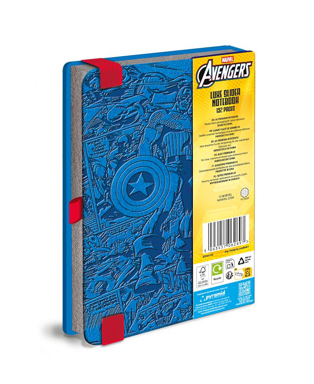 Twarda okładka nawiązuje do kadrów z uniwersum Marvela, a elastyczna opaska z emblematem tarczy pomaga utrzymać notes bezpiecznie zamknięty w torbie.