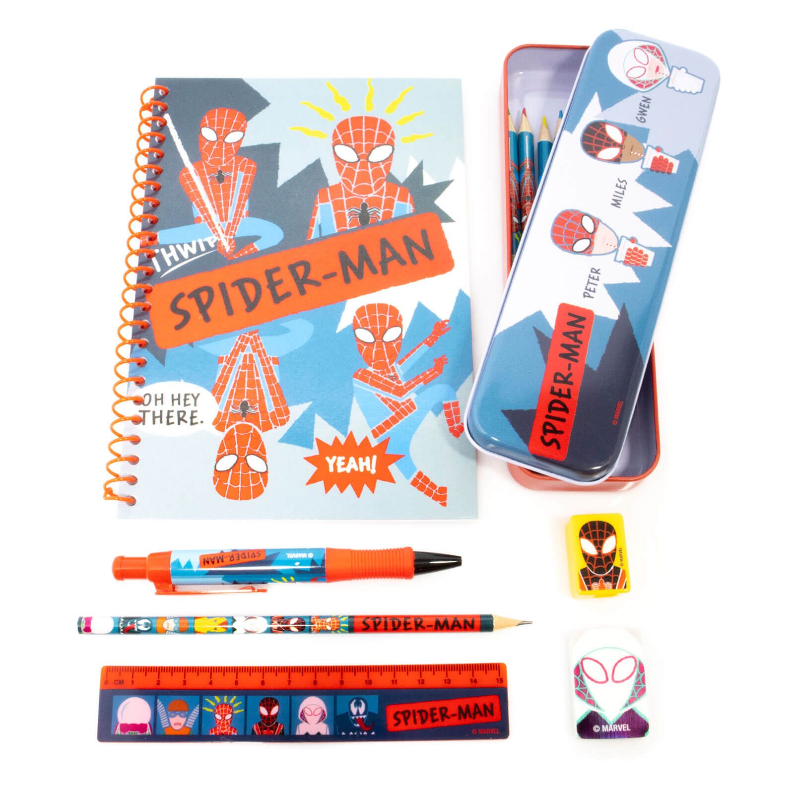 staw przyborów szkolnych Marvel Spider-Man Sketch Oryginalny zestaw przyborów szkolnych składających się z: ołówek długopis linijka gumka do mazania temperówka kredki notes A5 piórnik Idealny dla dzieci i młodzieży.
