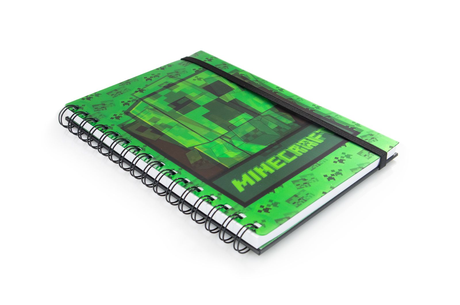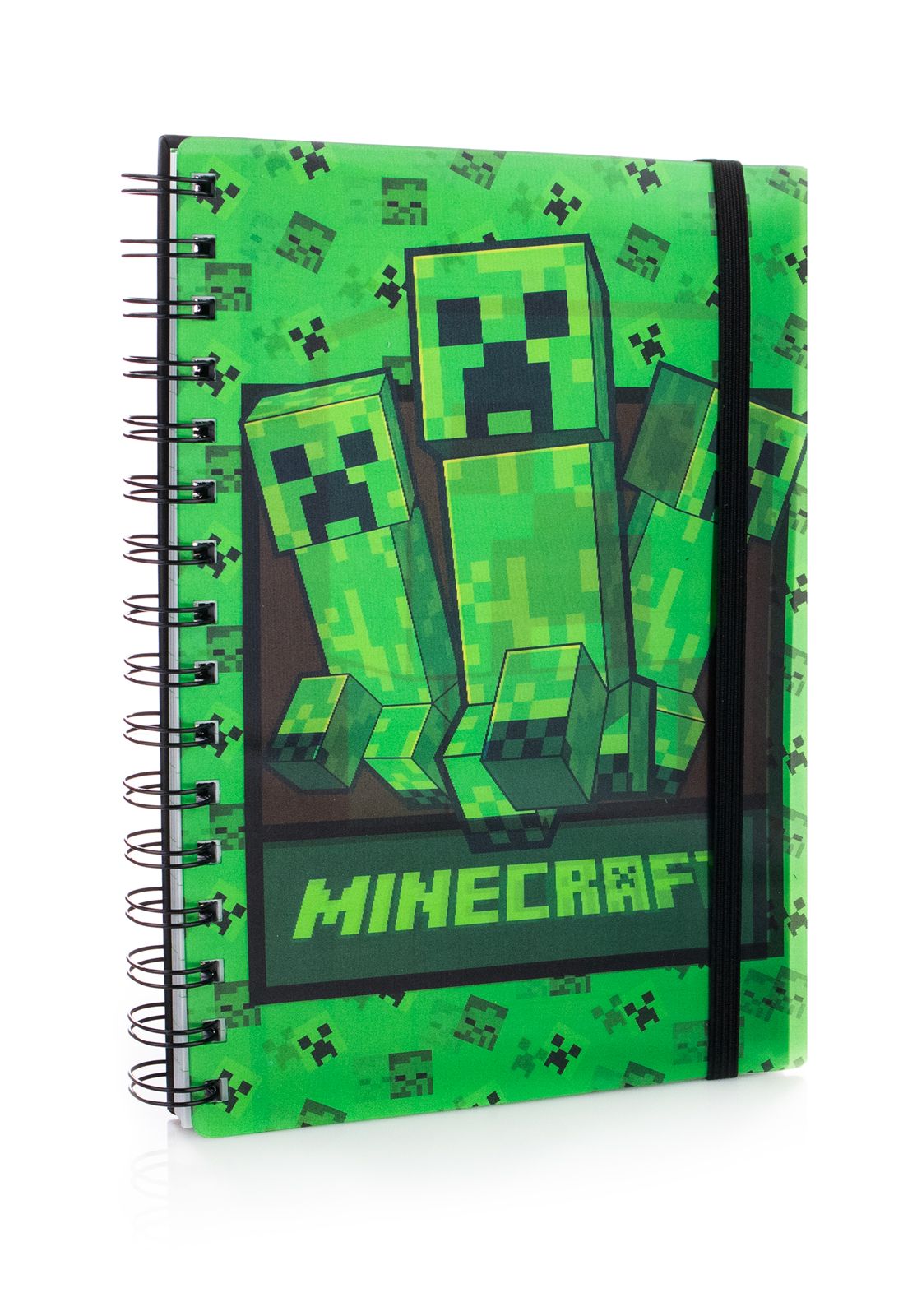 Minecraft Creeper - notes A5 kołozeszytz okładką 3D Notes Minecraft Creeper posiada twardą okładkę 3D z dużym Creeperem i zielonym pikselowym tłem.
