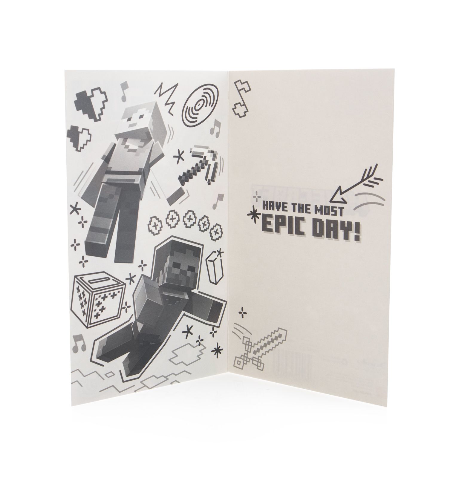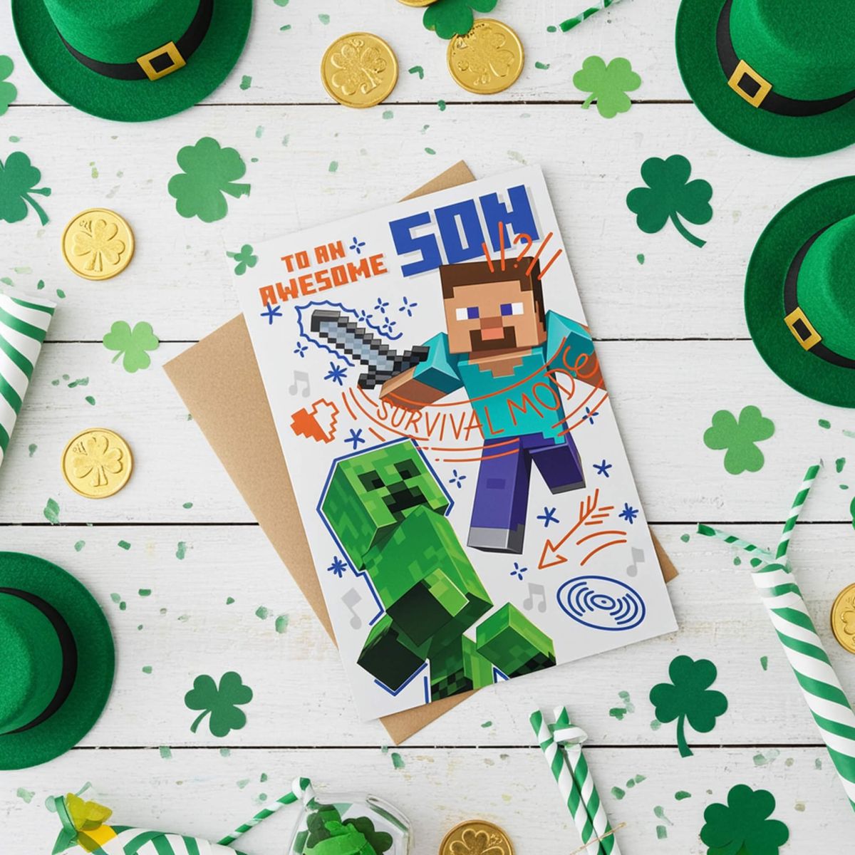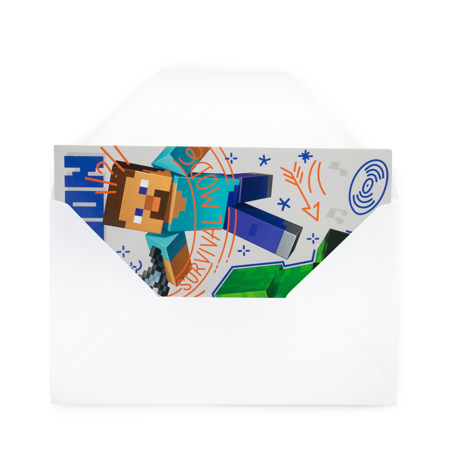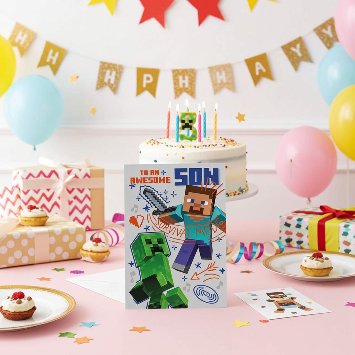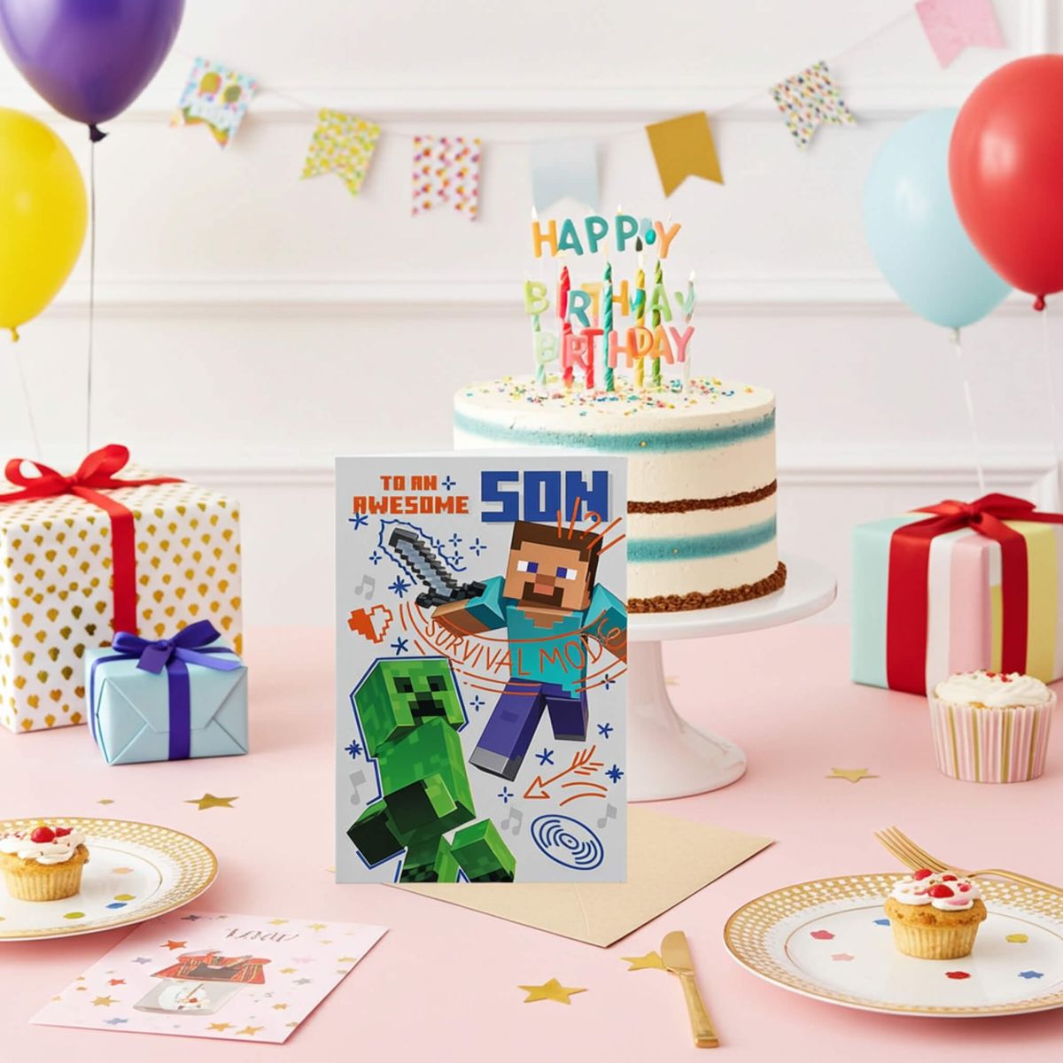 Minecraft Son - kartka urodzinowa Kartka urodzinowa Minecraft Son to propozycja stworzona z myślą o młodszych fanach gry. Kolorowy nadruk inspirowany światem bloków i przygód przyciąga uwagę dzieci, a nadrukowane życzenia wewnątrz sprawiają, że produkt jest gotowy do wręczenia. Idealny dodatek do prezentu dla chłopca. Szczegóły produktu: Format: 15 x 23 cm Motyw: Minecraft Son Wnętrze: z nadrukowanymi życzeniami Oficjalny produkt z licencją Licencjonowana kartka Minecraft - oryginalny produkt odpowiedni do sprzedaży hurtowej i detalicznej.