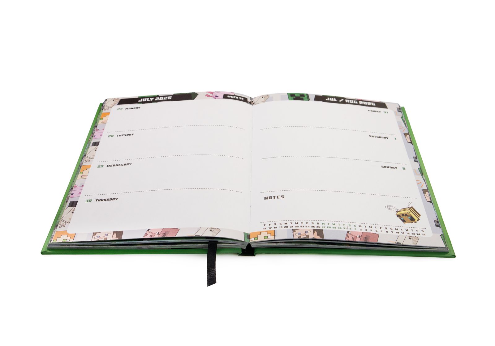 Kalendarz książkowy A5 Minecraft 2026 Organizer A5 z motywem Minecraft: twarda okładka, układ tygodniowy z miejscami na cele, notatki i adresy - idealny dla fanów planowania w stylu gry. Papier wysokiej jakości, ekologiczny design. Szczegóły techniczne: Format: A5 (ok. 15 × 21 cm) Układ: tygodniowy (Week-to-View) z miejscem na cele oraz stronami na notatki i adresy Ilość stron: 146 Okładka: twarda z grafiką Minecraft Papier: wysokiej jakości Opakowanie: eco-friendly (plastic-free) Licencjonowany produkt Autentyczny kalendarz Minecraft z oficjalną licencją.
