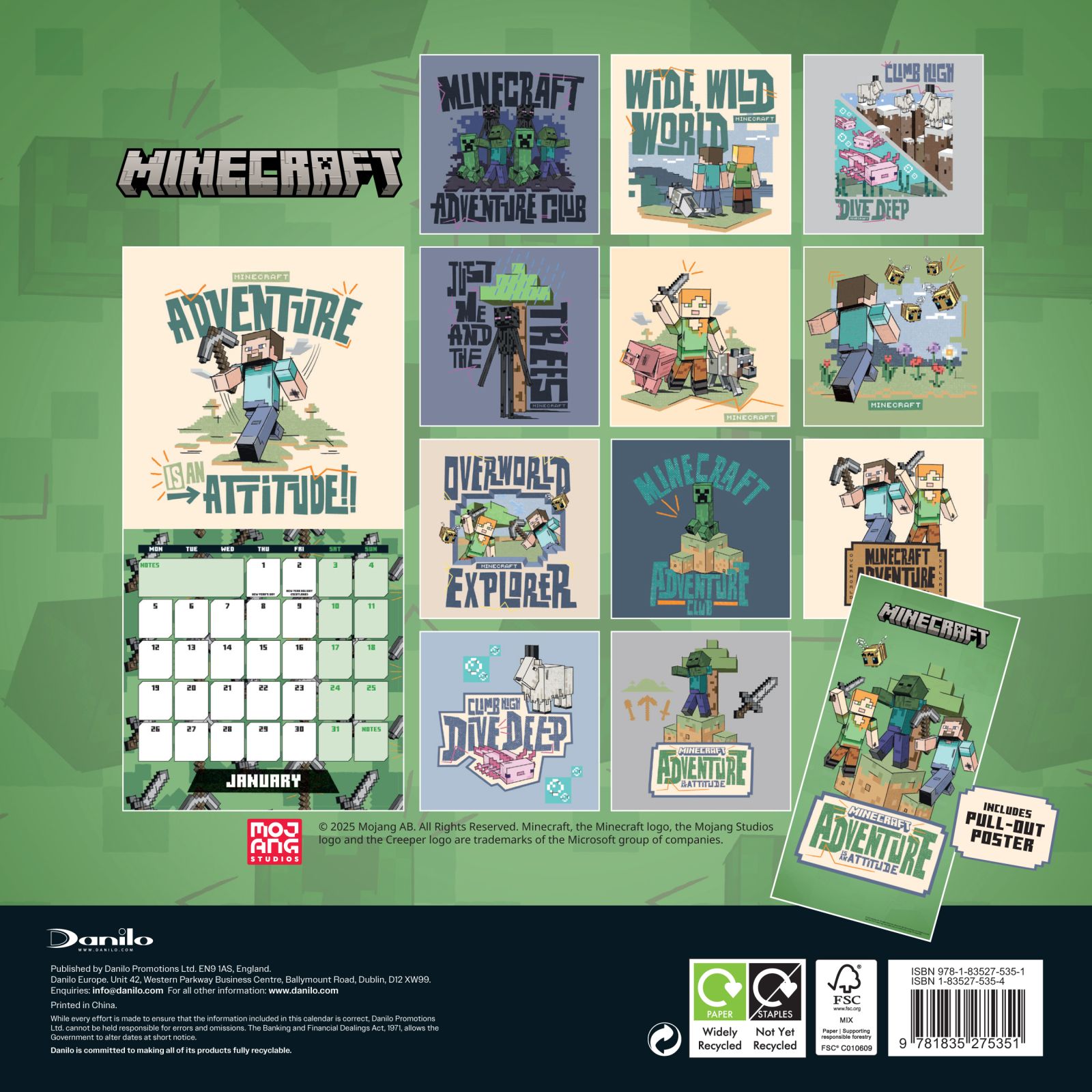 Minecraft oficjalny mini kalendarz na ścianę na 2026 rok Oryginalny i licencjonowany kalendarz, posiada 12 rozkładanych stron o wymiarach 18x18 cm. Na każdej z kart znajduje się kolorowa grafika z kultowej gry oraz czytelne kalendarium. W kalendarzu znajduje się 12 unikalnych ilustracji ze świata Minecraft, które doskonale oddają klimat pixelowej przygody. Okładki i wnętrze wykonane są z wysokiej jakości papieru w wersji ekologicznej, wolnej od plastiku. Nagłówki są w języku angielskim. Oprawa zszywkowa. Format mini 18x18 cm. 12 miesięcznych stron + okładka. Zawiera otwór 5 mm do zawieszenia na ścianie.