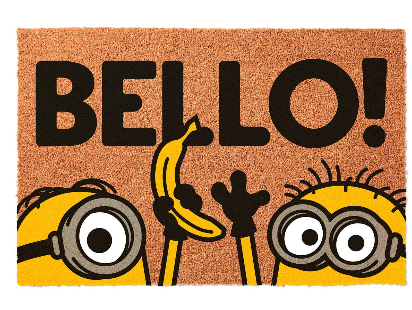 Wycieraczka Minionki Bello Z naszą wycieraczką zachowasz czystość w domu i zaskoczysz znajomych już przy wejściu. Wycieraczka z oryginalnym motywem to nie tylko przydatny gadżet, ale też świetna ozdoba mieszkania. Wykonana jest z naturalnego włosia kokosowego. Została podklejona gumą aby zapobiec poślizgowi. Jest oryginalna, to oficjalne, licencjonowane wydanie. Rozmiar wycieraczki: 40x60 cm. Wysokość: 1,5 cm.