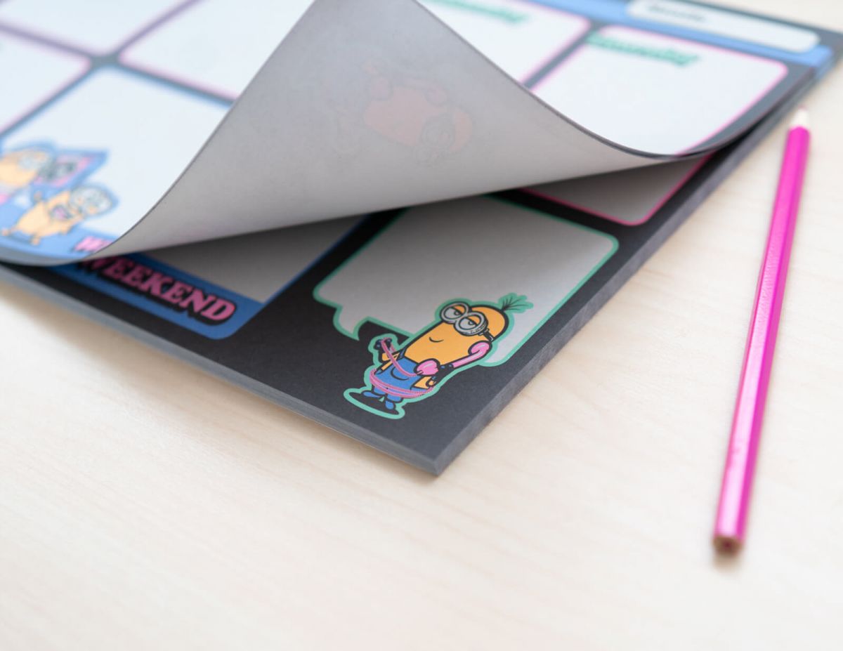 Tygodniowy planer Minionki Planer A4 z ulubionym motywem w któym zaplanujesz cały tydzień. Planer zadrukowany jestkolorowymi grafikamizwiązanymi z głównym motywem. Ma dużo miejsca na notatki na każdy dzień tygodnia. Arkusze są przyklejone na krótkim boku (orientacja pozioma) i nie mają okładki. Tooryginalny produktposiadający licencję producenta. Szczegóły techniczne Wymiary planera:29,7 x 21 cm Marka: Erikgroup