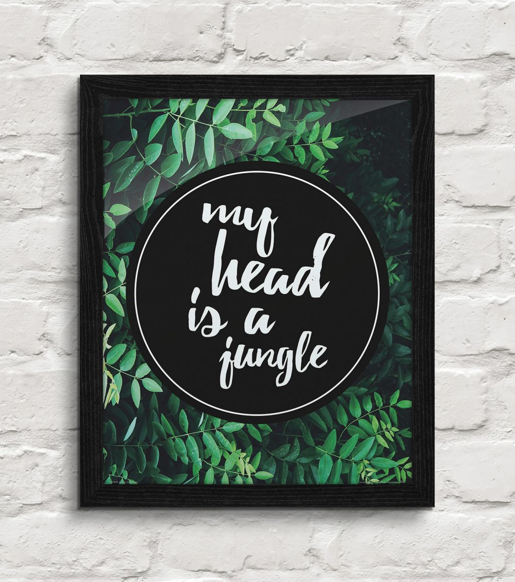 Plakat na ścianę, zatytułowany My head is a jungle Ciekawy i oryginalny plakat na ścianę. Wyprodukowany na papierze o wysokiej gramaturze w cyfrowej jakości. Plakat wykonany przez polskiego producenta. Świetnie nadaje się do oprawienia w ramy lub antyramy. Specyfikacja papier satynowy 220g/m2 druk cyfrowy wymiary plakatu 40x50 cm