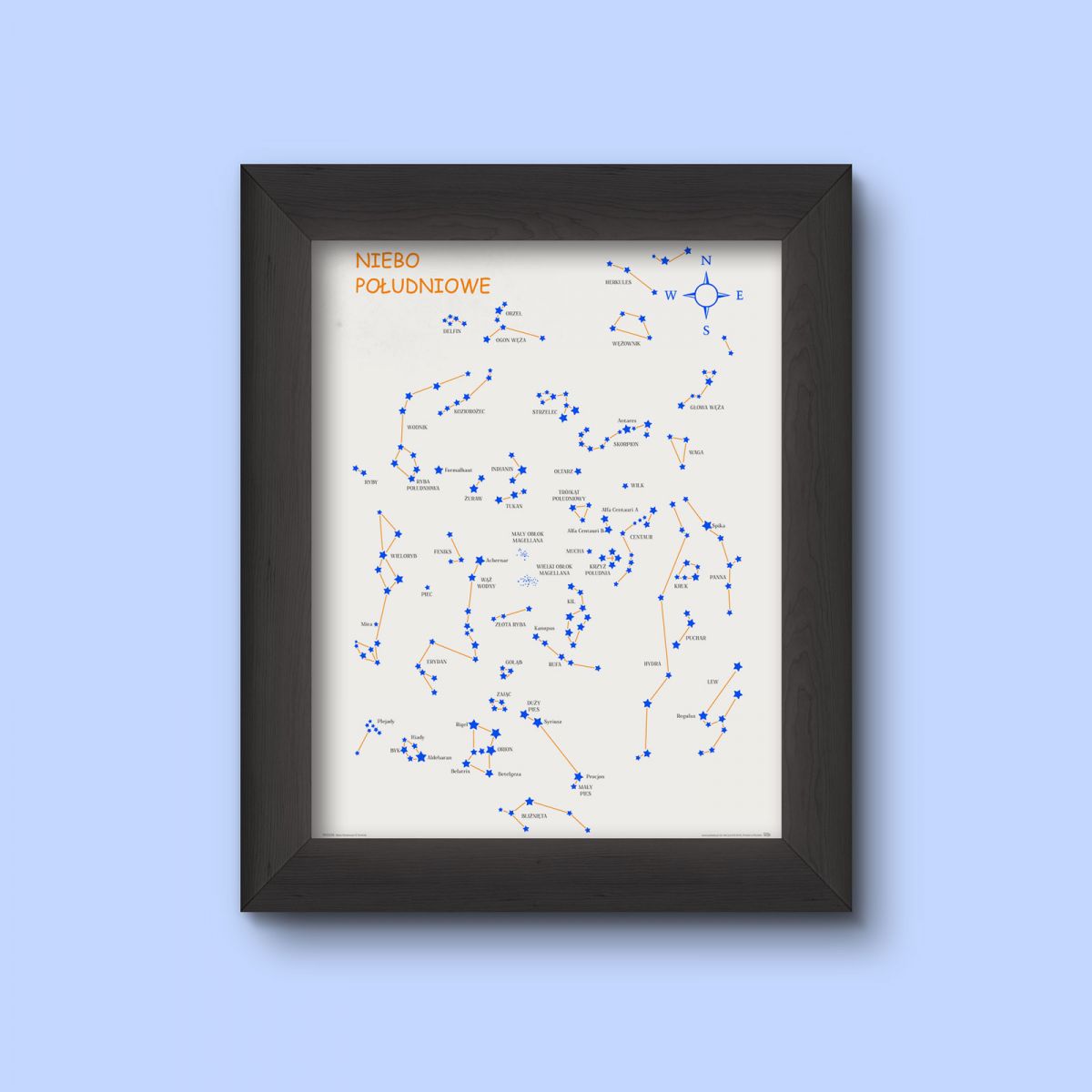 Plakat z mapą na ścianę, zatytułowany Niebo Południowe białe Ciekawy i oryginalny plakat na ścianę. Wyprodukowany na papierze o wysokiej gramaturze w cyfrowej jakości. Plakat wykonany przez polskiego producenta. Świetnie nadaje się do oprawienia w ramy lub antyramy. Specyfikacja papier satynowy 220g/m2 druk cyfrowy wymiary plakatu 40x50 cm