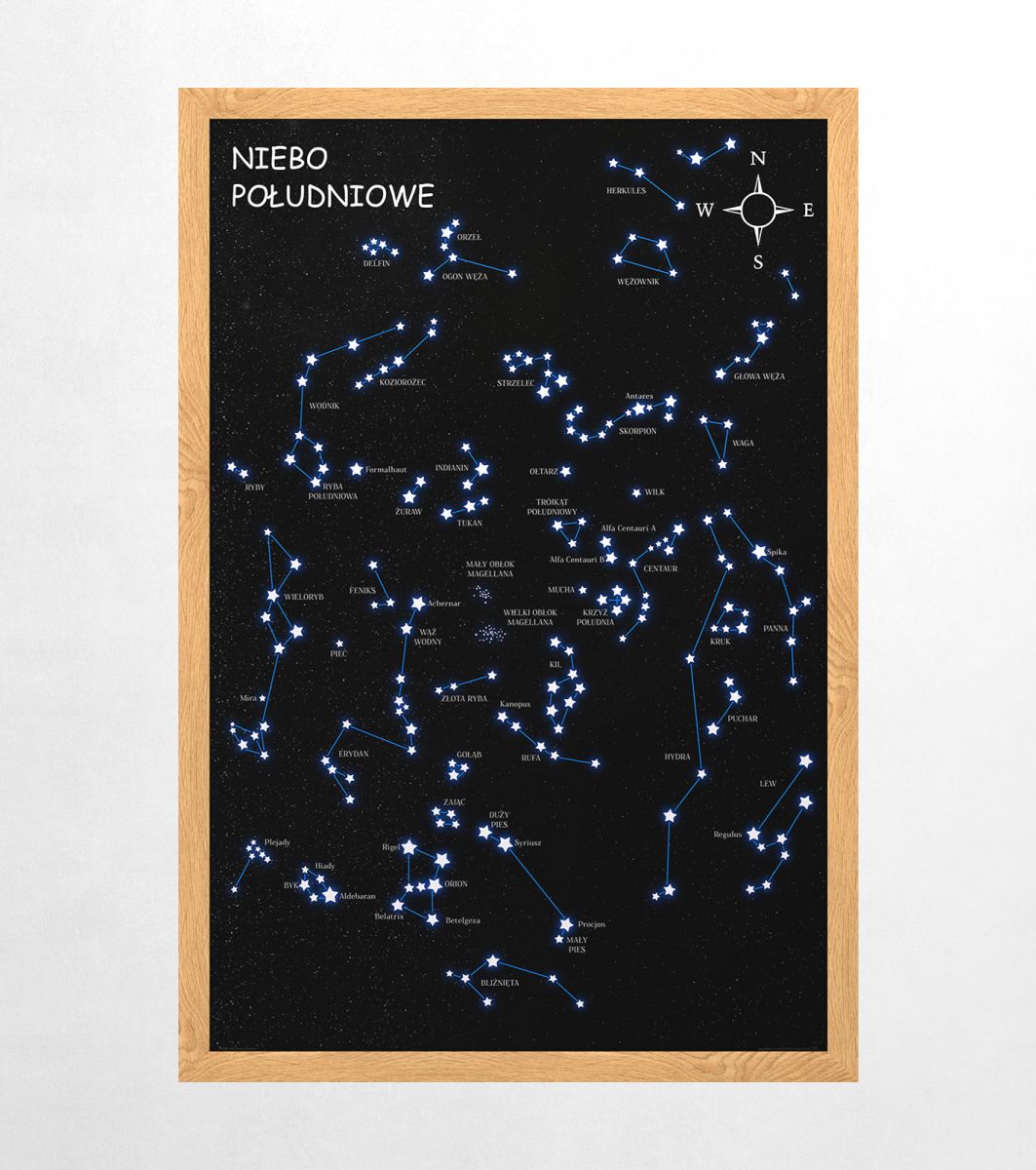 Plakat z mapą na ścianę, zatytułowany Niebo Południowe czarne Ciekawy i oryginalny plakat na ścianę. Wyprodukowany na papierze o wysokiej gramaturze w cyfrowej jakości. Plakat wykonany przez polskiego producenta. Świetnie nadaje się do oprawienia w ramy lub antyramy. Specyfikacja papier satynowy 220g/m2 druk cyfrowy wymiary plakatu 61x91,5 cm