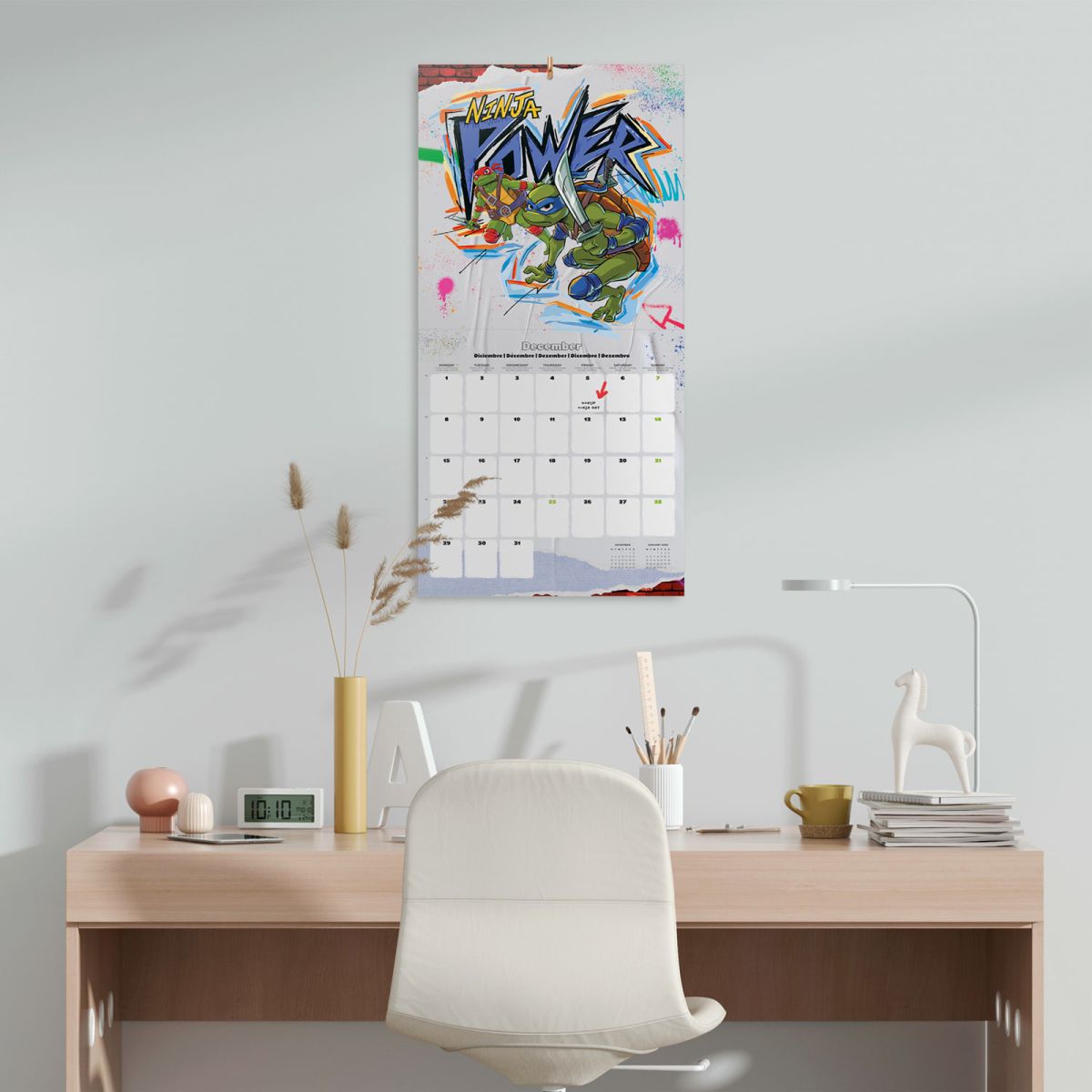 Ninja Turtles oficjalny kalendarz na ścianę na 2025rok Oryginalny i licencjonowany kalendarz, posiada 12 rozkładanych stron o wymiarach 30x60 cm. Na każdej z kart znajduje się duża fotografiaoraz czytelne kalendarium z miejscem na notatki. W kalendarzu znajduje się 12 unikalnych zdjęć dla każdego miesiąca. Okładki wykonane są z papieru powlekanego matowego i laminowanego o gramaturze 250 g/m?, wnętrze z papieru powlekanego matowego o gramaturze 150 g/m?. Nagłówki są w 6 językach: angielski, hiszpański, francuski, niemiecki, włoski i portugalski Oprawa zszywkowa. Złożony kalendarz 30x30 cm. Rozłożony kalendarz 30x60 cm. Zawiera otwór 5 mm do zawieszenia na ścianie.