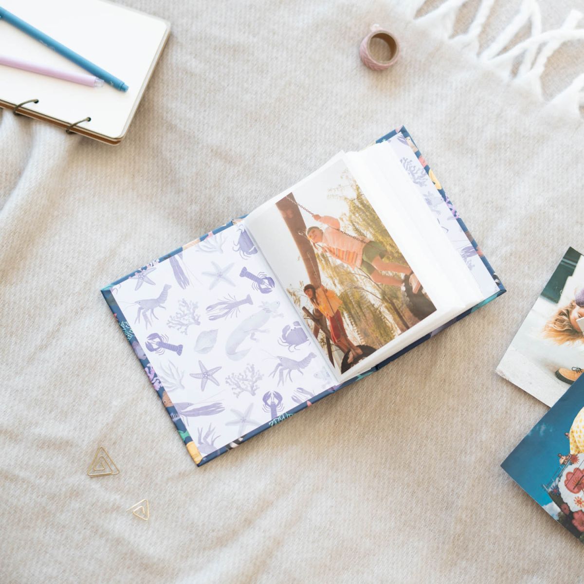 Ocean Friends - Album na zdjęcia Album w twardej okładce zabezpieczony foliową obwolutą. Jego strony posiadają kieszonkę z folii, która ułatwia umieszczanie fotografii. Album posiada 100 stron, na których umieścić możesz 100 zdjęć w rozmiarze: 10x15 cm, 9x13 cm, INSTAX, POLAROID Szczegóły techniczne: Wymiary zewnętrzne: 13x17 cm Wymiary strony: 11x15,5 cm Okładka: twarda, papierowa Karty: miękkie, tworzywo sztuczne, kieszenie Rodzaj albumu: zdjęcia wsuwane Wykończenie albumu: klejony Kolor kart: biały Oryginalny design: Motyw oceanu sprawia, że album świetnie komponuje się z kolekcją miłośników morskich klimatów.