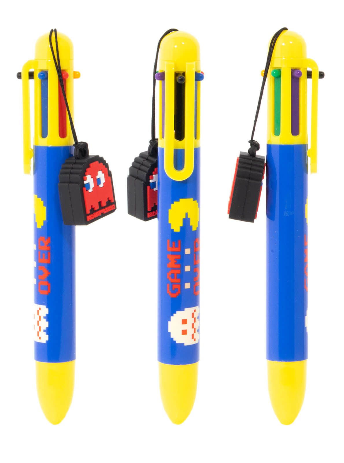 Wielokolorowy długopis Pac-Man Game Over Automatyczny długopis wielokolorowy. Posiada 6 wkładów: czarny, fioletowy, niebieski, czerwony, pomarańczowy i zielony. Idealny dla dzieci i młodzieży. Świetny pomysł na podarunek! Zestaw posiada oficjalną licencję producenta. Szczegóły techniczne: Marka: Pyrmid Posters Wymiary opakowania:21,5 x 3 x 9 cm