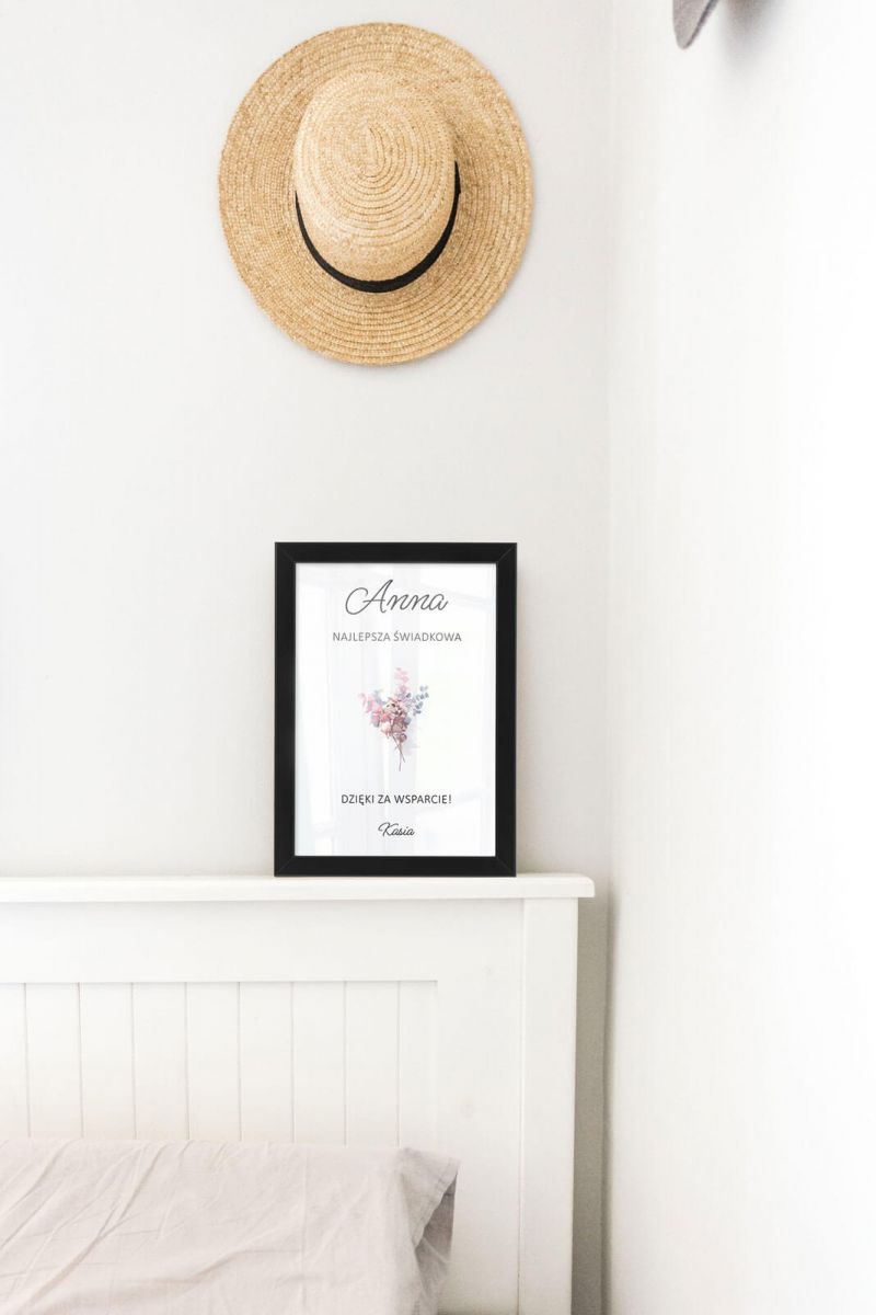 Plakat A4 Podziękowanie dla Świadkowej w czarnej ramce Jeśli szukasz oryginalnego sposobu by podziękować swojej świadkowej za okazaną pomoc, to plakat w ramie z kolorową grafiką z Waszymi imionami będzie świetnym wyborem. Taki plakat to wzruszający prezent, którypozostanie wspaniałą pamiątką na lata. Nasze plakaty wyróżnia: Rewelacyjna jakość, Nasycone iwyraźnebarwy, Wytrzymały papier220g/m2 Satynowa powierzchnia, Druk cyfrowy, Oprawiony w prostą i smukłą czarną ramkę. Jak zamówić plakat z podziękowaniem dla Świadkowej? Zamów interesujący Cię rozmiar i dokonaj płatności. Na maila, który podałeś w formularzu otrzymasz wiadomość z potwierdzeniem zamówienia. W odpowiedzi zwrotnej do potwierdzenia napisz nam, jakie imiona mają mieć Panna Młoda i Świadkowa. Gotowe!