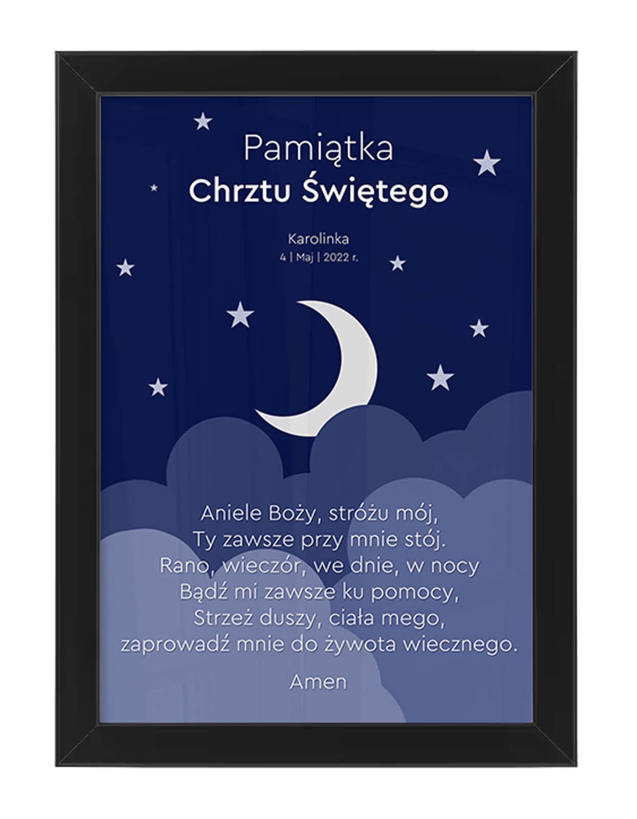 Plakat A4 Plakat dla dzieci Pamiątka Chrztu Świętego 21x29,7 cm Jeśli szukasz prezentu na pamiętkę Chrztu Świętego, to zamów nasz oryginalny plakat! Znajduje się na nimmodlitwa, data oraz imię dziecka. Nasze plakaty wyróżnia: Rewelacyjna jakość, Nasycone iwyraźnebarwy, Wytrzymały papier220g/m2 Satynowa powierzchnia, Druk cyfrowy. Jak zamówić plakatPamiątka Chrztu Świętego? Zamów interesujący Cię rozmiar i dokonaj płatności, a namaila, który podałeś w formularzu otrzymasz wiadomość z potwierdzeniem zamówienia. W odpowiedzi zwrotnej podaj nam miejscowość oraz dane, jakie mają znaleźć się na plakacie.