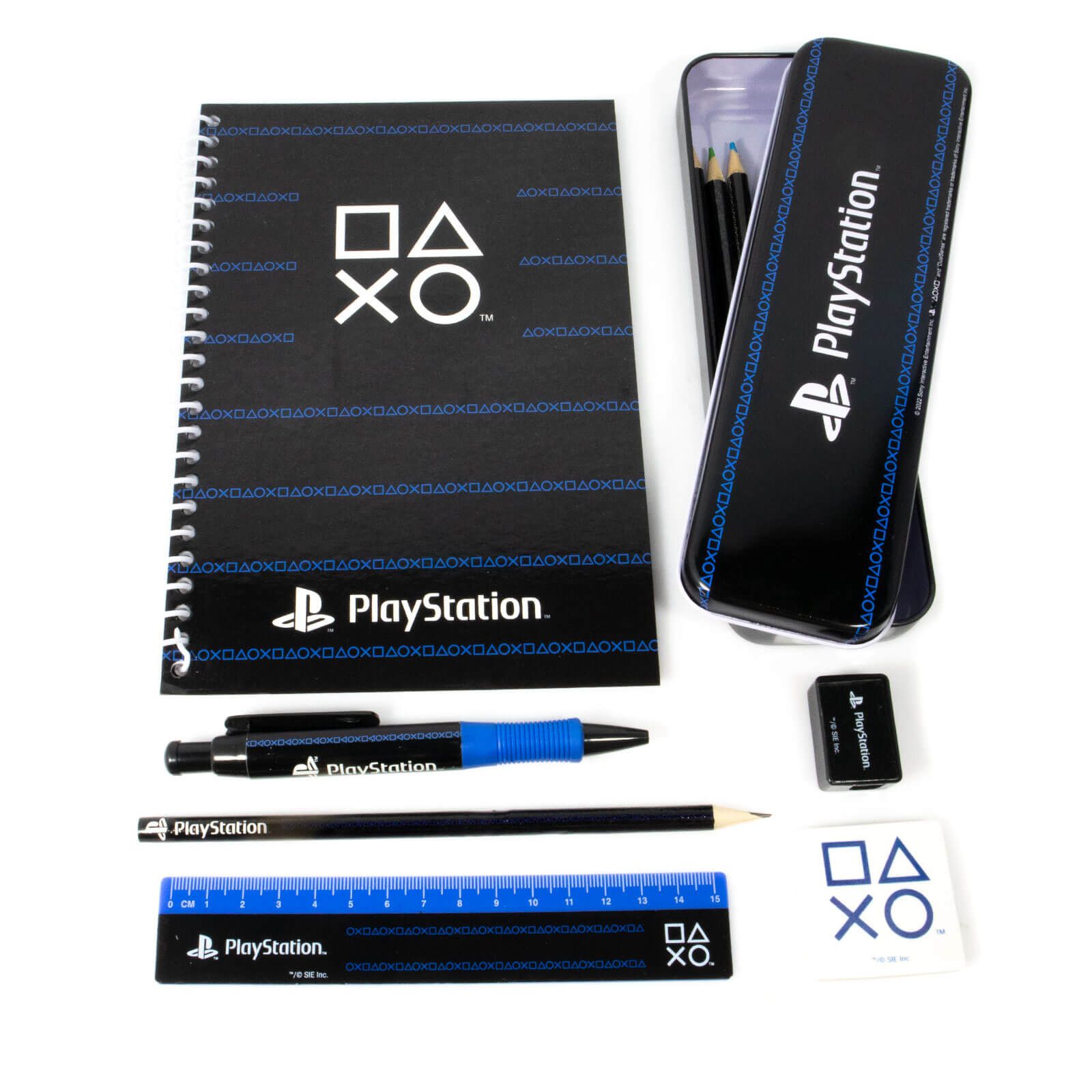 staw przyborów szkolnych Playstation Pinstripe Dark Bumper Oryginalny zestaw przyborów szkolnych składających się z: ołówek długopis linijka gumka do mazania temperówka kredki notes A5 piórnik Idealny dla dzieci i młodzieży.