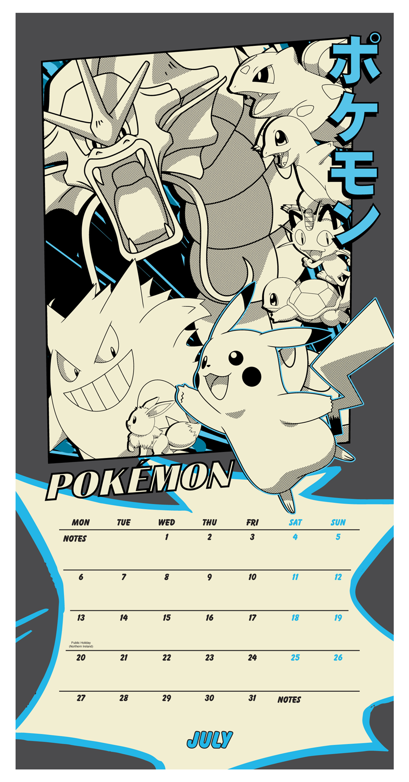 Pokemon oficjalny kalendarz na ścianę na 2026rok Oryginalny i licencjonowany kalendarz, posiada 12 rozkładanych stron o wymiarach 30x60 cm. Na każdej z kart znajduje się duża fotografiaoraz czytelne kalendarium z miejscem na notatki. W kalendarzu znajduje się 12 unikalnych zdjęć dla każdego miesiąca. Okładki wykonane są z papieru powlekanego matowego i laminowanego o gramaturze 250 g/m?, wnętrze z papieru powlekanego matowego o gramaturze 150 g/m?. Nagłówki są w języku angielskim. Oprawa zszywkowa. Złożony kalendarz 30x30 cm. Rozłożony kalendarz 30x60 cm. Zawiera otwór 5 mm do zawieszenia na ścianie.