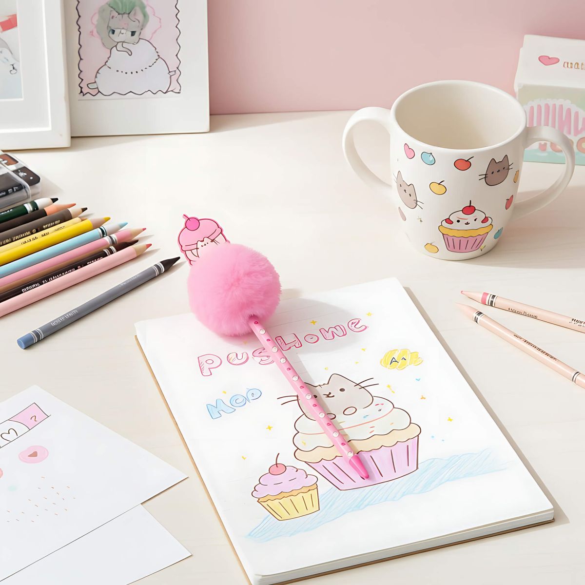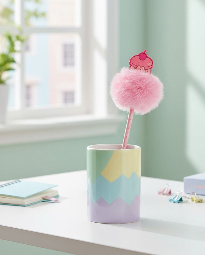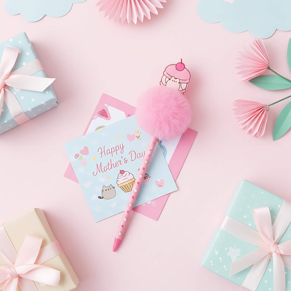 Pusheen Cherry - długopis z pomponem Numer katalogowy: SR2403056 Producent: Pyramid International Wymiary: 6,5 x 6,5 x 25,5 cm Długopis kulkowy z serii Pusheen Cherry łączy pastelowy korpus z pomponem i topperem 3D, tworząc efektowny, a zarazem wygodny w użyciu gadżet. Lekko piszący, niebieski tusz sprawdza się w notatkach i planerach, a miękki pompon dodaje długopisowi charakteru. Detaliczny nadruk z Pusheen i wiśniami prezentuje się stylowo na biurku i w piórniku. Szczegóły techniczne: Rodzaj: długopis kulkowy Kolor tuszu: niebieski Wykończenie: topper 3D + pompon Motyw: Pusheen Cherry Oryginalny produkt na oficjalnej licencji Pusheen.