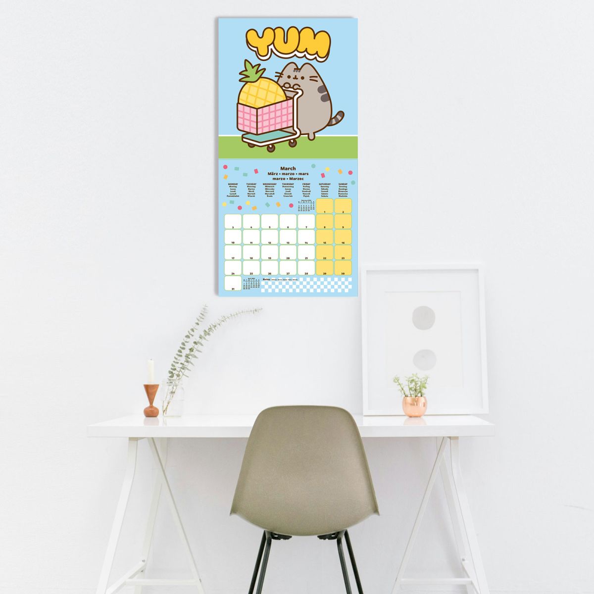 Pusheen Fruits oficjalny kalendarz na ścianę na 2025rok Oryginalny i licencjonowany kalendarz, posiada 12 rozkładanych stron o wymiarach 30x60 cm. Na każdej z kart znajduje się duża fotografiaoraz czytelne kalendarium z miejscem na notatki. Okładki wykonane są z papieru powlekanego matowego i laminowanego o gramaturze 250 g/m2, wnętrze z papieru powlekanego matowego o gramaturze 150 g/m2. Nagłówki są języku angielskim, niemieckim, hiszpańskim, francuskim, włoskim i polskim. Oprawa zszywkowa. Złożony kalendarz 30x30 cm. Rozłożony kalendarz 30x60 cm. Zawiera otwór 5 mm do zawieszenia na ścianie.