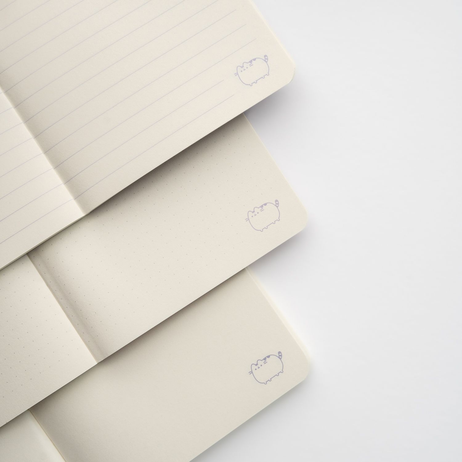 Każdy zeszyt ma miękką oprawę z trzema różnymi wzorami Pusheen oraz układy stron: linie, kropki i czyste, co zapewnia wszechstronność użytkowania.