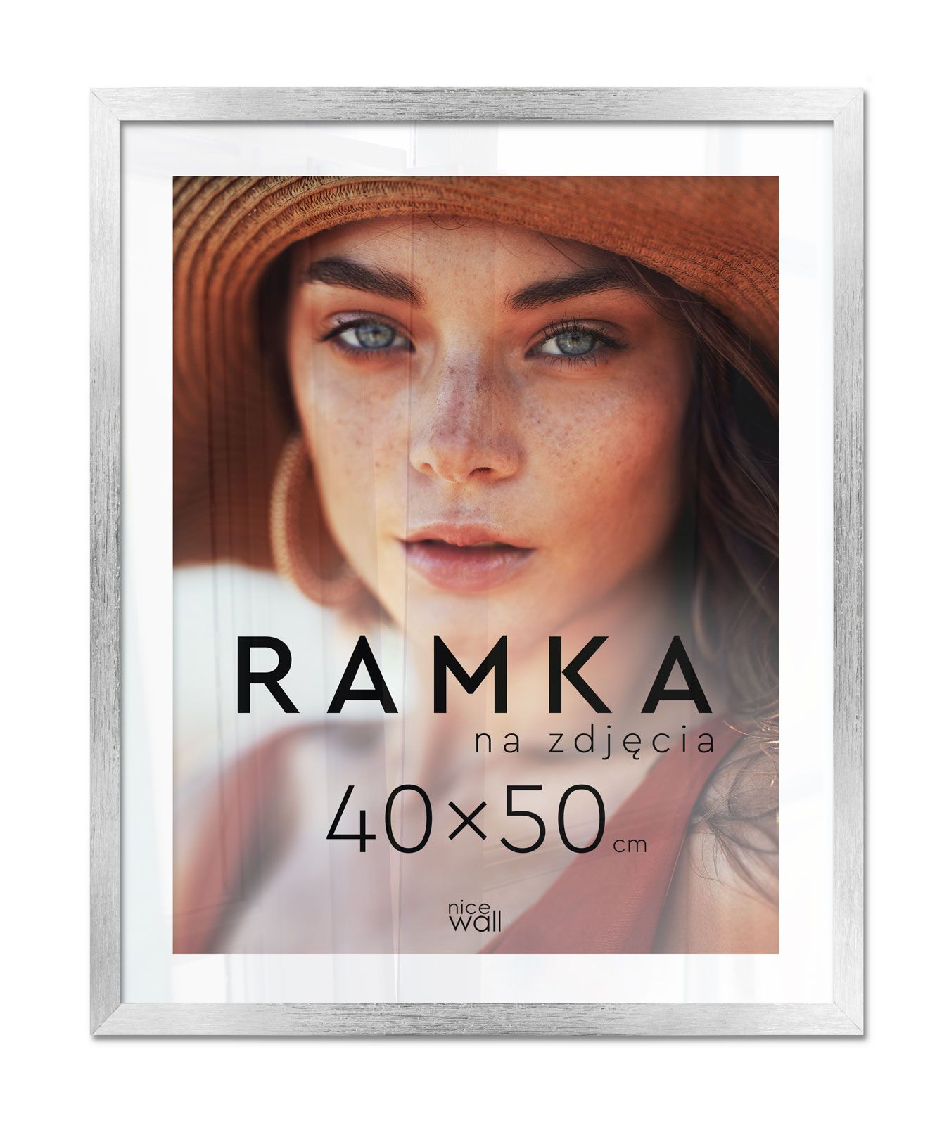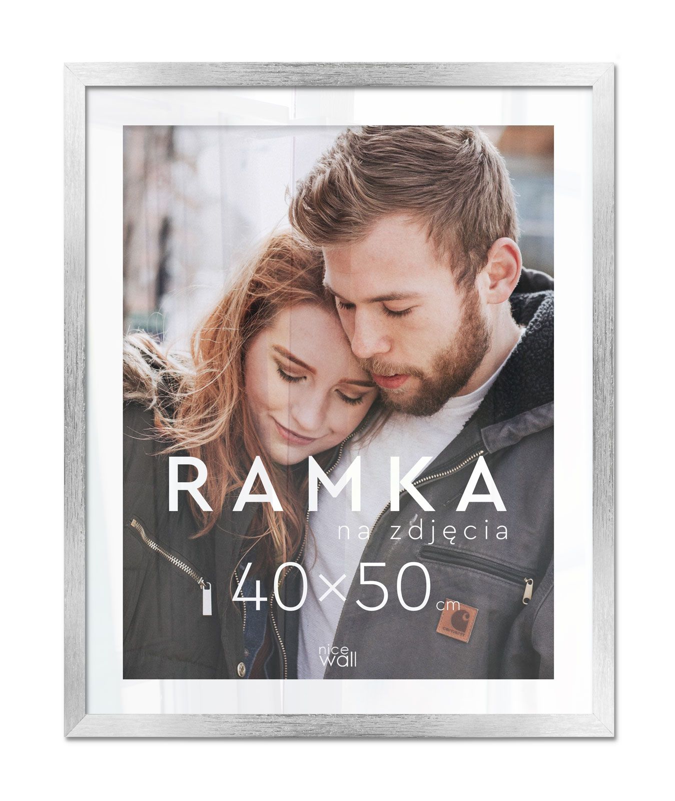 Ramka na zdjęcia 40x50 cm Srebrna Eleganckie ramki do oprawy plakatów, zdjęć i rysunków. Wykonane zpłyty pilśniowej, polistyrenu i lekkiej, przejrzystej pleksy 1 mm. Ramę można powiesić w pionie lub poziomie. Każdy egzemplarz jest zafoliowany. Posiadającertyfikat FSC. Wyprodukowanew Polsce. Wymiary ramy: 40x50 cm. Wymiary profilu: front 1,5 cm, bok 1,3 cm,