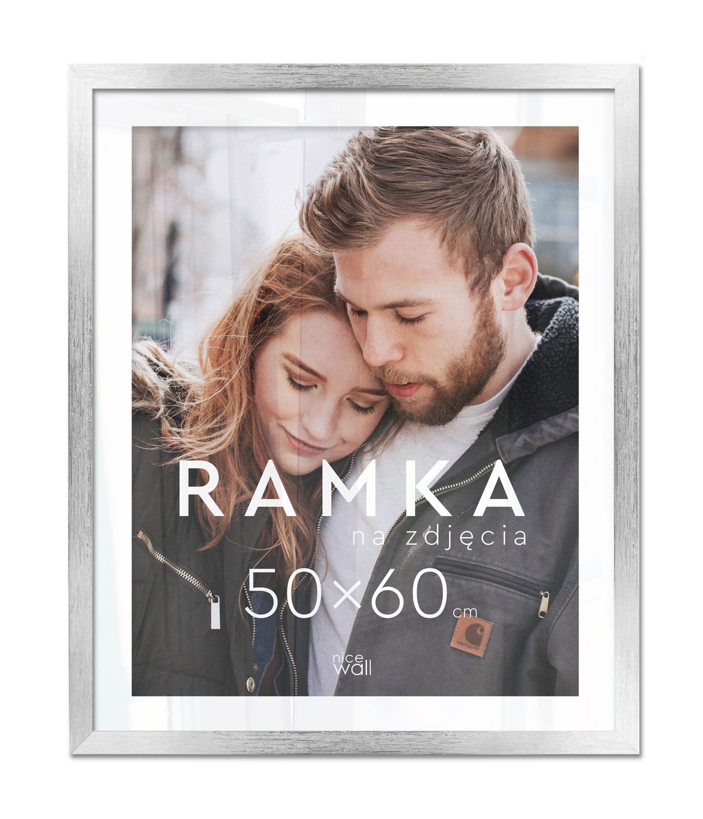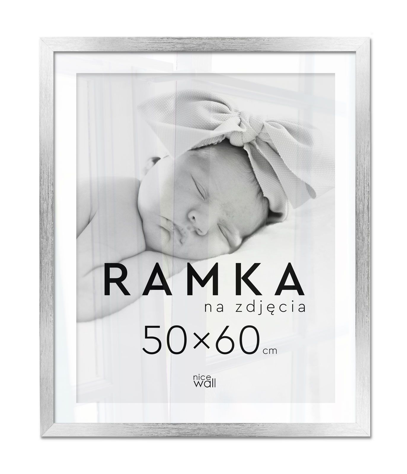 Ramka na zdjęcia 50x60 cm Srebrna Eleganckie ramki do oprawy plakatów, zdjęć i rysunków. Wykonane zpłyty pilśniowej, polistyrenu i lekkiej, przejrzystej pleksy 1 mm. Ramę można powiesić w pionie lub poziomie. Każdy egzemplarz jest zafoliowany. Posiadającertyfikat FSC. Wyprodukowanew Polsce. Wymiary ramy: 50x60 cm. Wymiary profilu: front 1,5 cm, bok 1,3 cm,