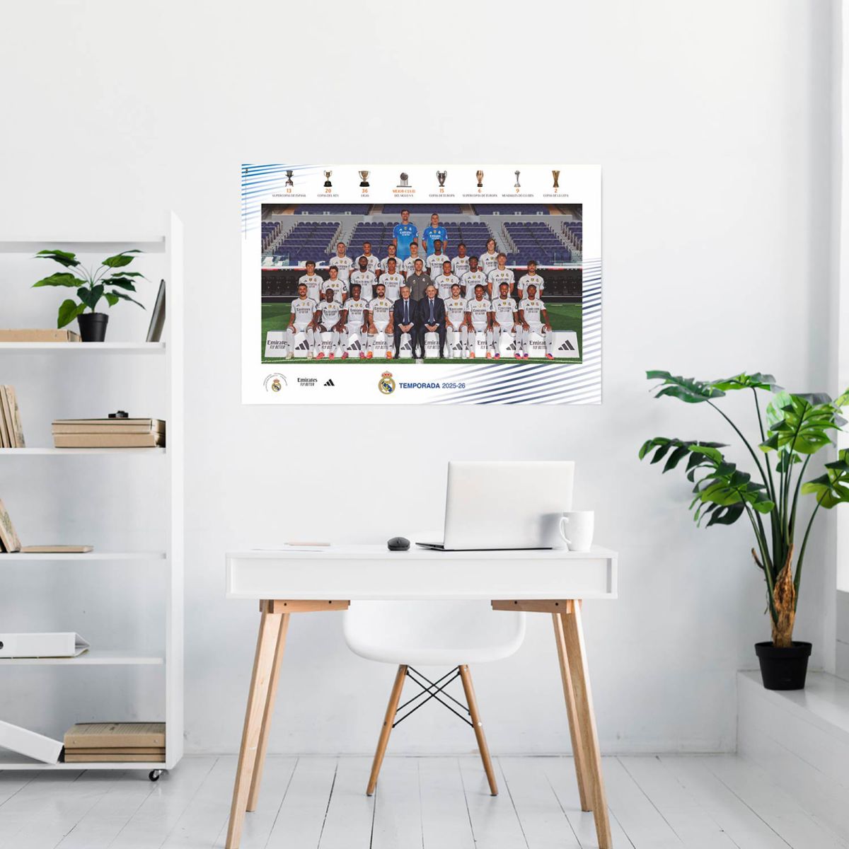 Plakat na ścianę Real Madrid 2025/2026 Plakat Real Madrid 2025/2026 przedstawia oficjalny skład drużyny na sezon 2025/2026 w formie czytelnej, estetycznej grafiki o sportowym charakterze. Duży format pozwala dobrze wyeksponować zawodników, detale strojów oraz klubową identyfikację wizualną. Wydruk na grubym papierze sprawia, że plakat prezentuje się solidnie i zachowuje dobrą jakość podczas ekspozycji w ramie lub antyramie. To dekoracja, która naturalnie wpisuje się w przestrzeń kibica piłki nożnej, nadając wnętrzu klubowy klimat. Plakat może stanowić centralny element aranżacji ściany lub uzupełnienie kolekcji gadżetów związanych z Real Madrid.