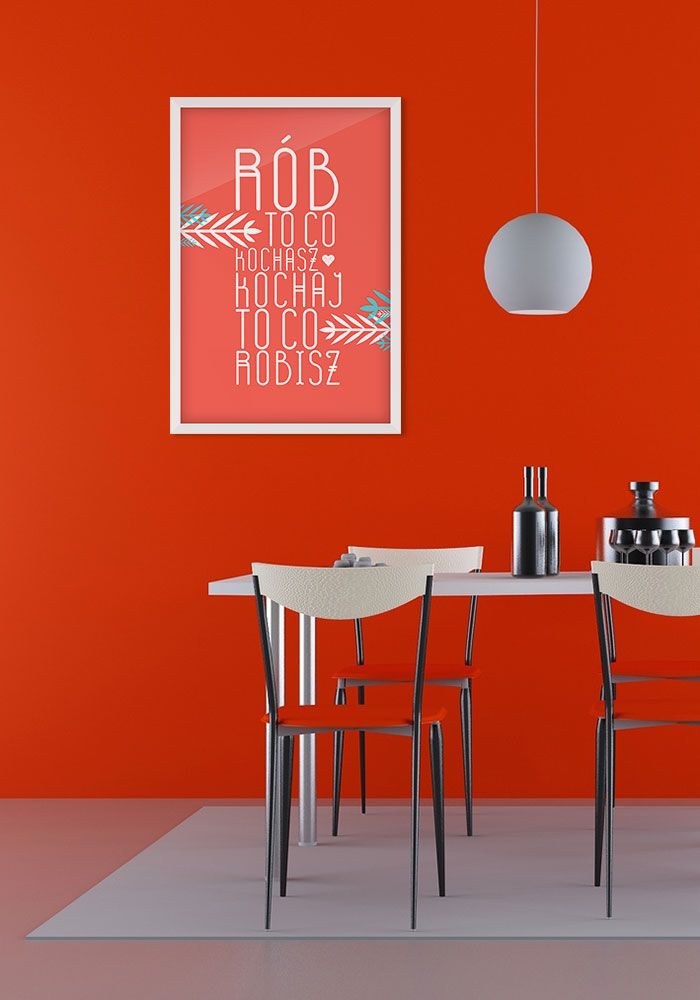 Plakat na ścianę zatytułowany Rób co kochasz Szukasz oryginalnych, wykonanych z najwyższą starannością dekoracji? Drukujemy dla Ciebie na materiałach najlepszej jakości a nasi graficy ciągle przygotowują ciekawe, nowoczesne wzory plakatów. Plakat drukowany na grubym i mocnym papierze satynowym o gramaturze 220 g/m2 przez polskiego producenta. Dzięki temu umieszczony w ramie nie marszczy się i świetnie prezentuje przez długi czas. Powierzchnia plakatu jest matowa, zadrukowana w technologii druku cyfrowego co pozwoliło uzyskać głębokie nasycenie kolorów i niesamowitą ostrość obrazu. Wybierając ten produkt masz pewność, że otrzymasz fantastyczną jakość. Wszystkie plakaty z naszej oferty posiadają licencję, otrzymasz więc oryginalny produkt.