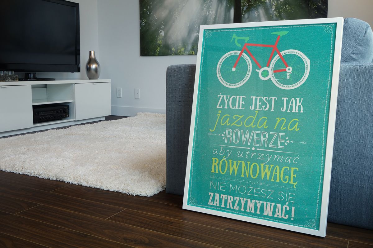 Plakat na ścianę zatytułowany Rower Szukasz oryginalnych, wykonanych z najwyższą starannością dekoracji? Drukujemy dla Ciebie na materiałach najlepszej jakości a nasi graficy ciągle przygotowują ciekawe, nowoczesne wzory plakatów. Plakat drukowany na grubym i mocnym papierze satynowym o gramaturze 220 g/m2 przez polskiego producenta. Dzięki temu umieszczony w ramie nie marszczy się i świetnie prezentuje przez długi czas. Powierzchnia plakatu jest matowa, zadrukowana w technologii druku cyfrowego co pozwoliło uzyskać głębokie nasycenie kolorów i niesamowitą ostrość obrazu. Wybierając ten produkt masz pewność, że otrzymasz fantastyczną jakość. Wszystkie plakaty z naszej oferty posiadają licencję, otrzymasz więc oryginalny produkt.