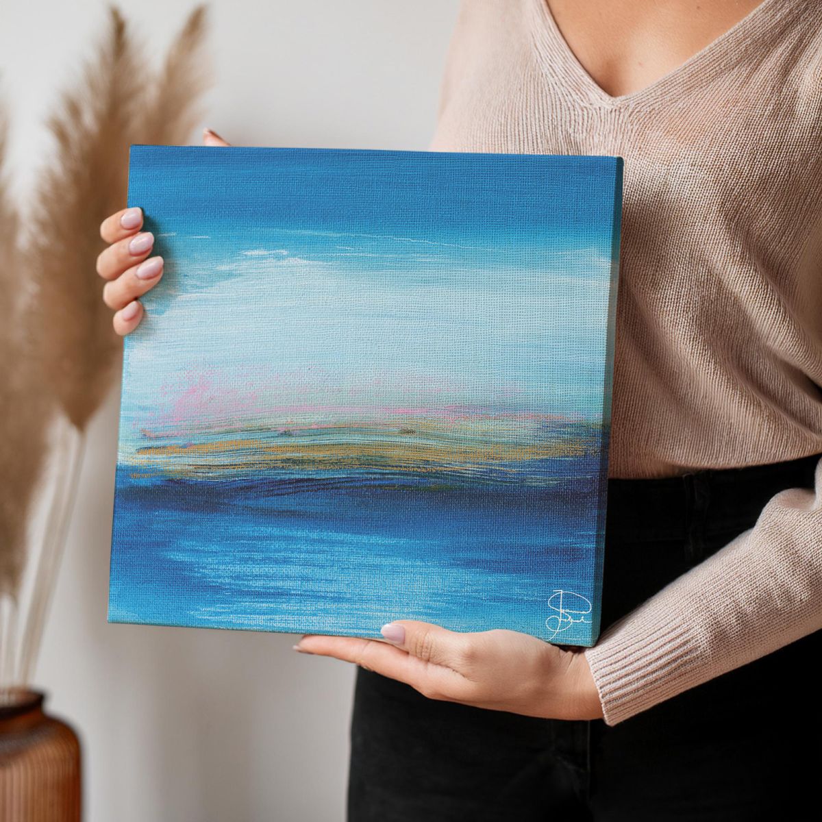 Obraz "Sea Salt in the Air" to abstrakcyjna kompozycja, która przywołuje uczucie spokoju i świeżości nadmorskiego powietrza. Niebieskie tony, wzbogacone złotymi i różowymi detalami, tworzą dynamiczną i harmonijną całość. Wykonany techniką akrylu na płótnie, obraz charakteryzuje się wysoką jakością i trwałością, co czyni go idealnym wyborem do nowoczesnych wnętrz. Dzięki swojej subtelnej elegancji, stanie się wyjątkowym elementem dekoracyjnym, wprowadzającym artystyczny akcent do każdego pomieszczenia. Produkt posiada licencję producenta, co potwierdza jego oryginalność i unikalność. Obraz na płótnie typu canvas. Sosnowe krosna. Produkt od razu gotowy do powieszenia na ścianę. Dbamy o każdy detal dlatego obraz jest solidny i piękny.Obraz jest ostry a barwy nasycone. Krawędzie obrazu są w pełni zadrukowane co gwarantuje estetyczne wykończenie bez konieczności dodatkowego oprawiania go. Mocne, trwałe płótno o ciekawej fakturze. Sosnowe Krosna zrobione z grubego drewna.