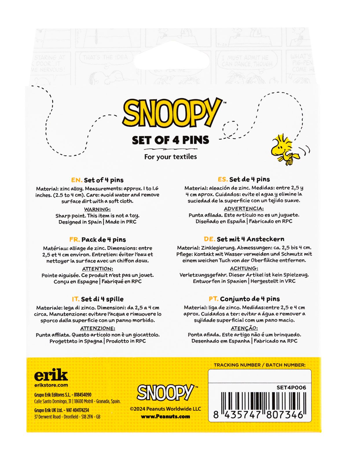 py - zestaw 4 przypinek Zestaw czterech przypinek z motywami Snoopy'ego to idealny gadżet dla fanów kultowej serii Peanuts. Przypinki wykonane z wysokiej jakości stopu cynku, ozdobione trwałą emalią, świetnie nadają się do dekoracji ubrań, toreb czy plecaków. Produkt zapakowany w eleganckie pudełko z okienkiem. Szczegóły techniczne: Wymiary: od 2,5 do 4 cm Materiał: Stop cynku, emaliowane Opakowanie: Pudełko ochronne z okienkiem Licencjonowany produkt Oryginalny produkt Snoopy, idealny jako upominek dla fanów serii Peanuts.