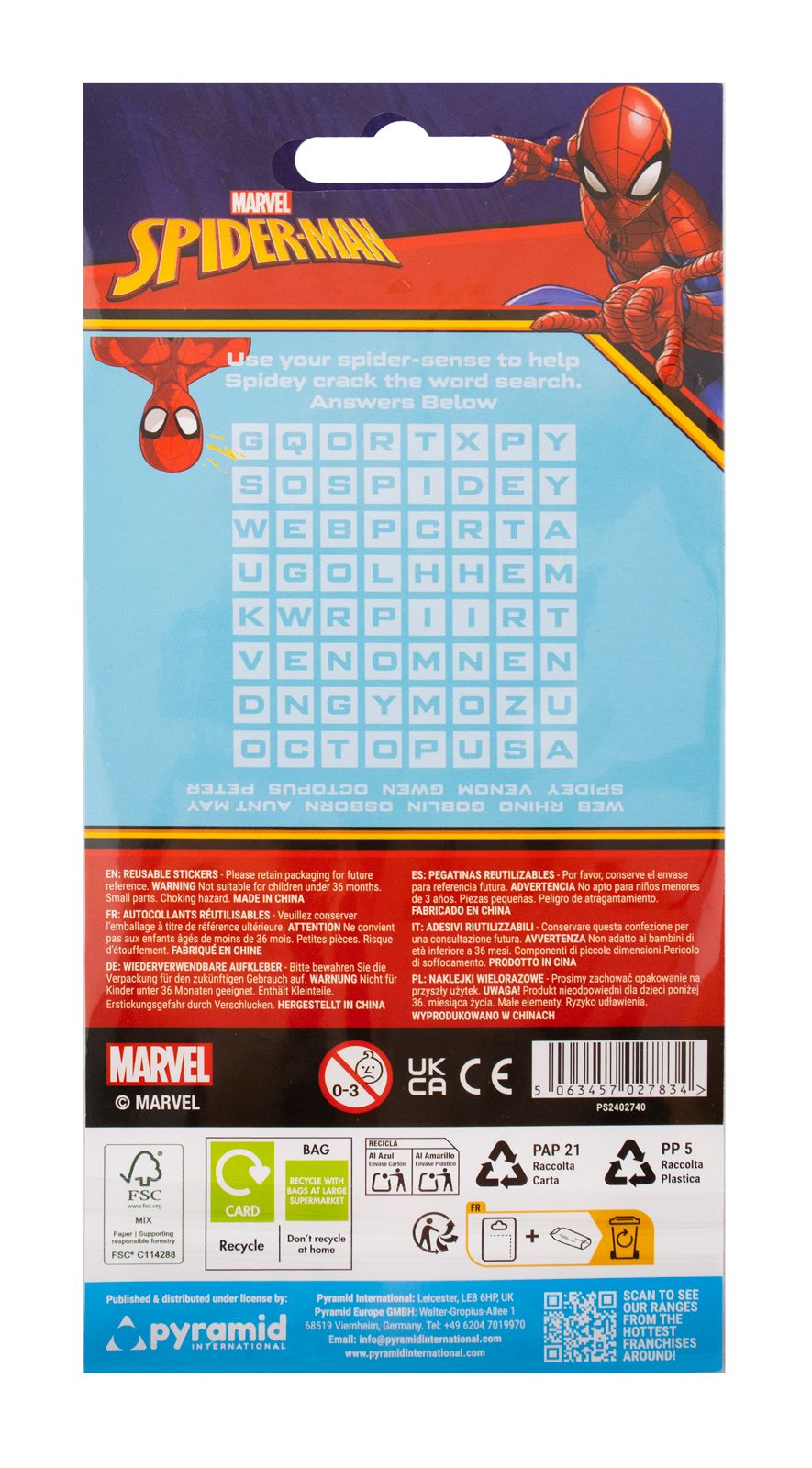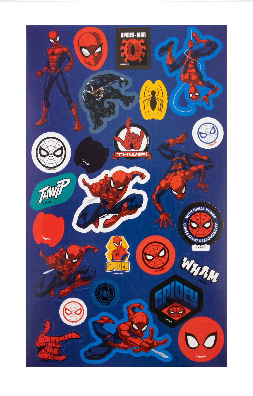 Spiderman Spidey zestaw 25 naklejek Zestaw naklejek z grafiką Spidermana z serii Marvel Spidey and His Amazing Friends. Naklejki wykonane z wypukłego, trwałego winylu, odporne na ścieranie, wielokrotnego użytku. Doskonały produkt do działu dziecięcego, geek/nerd lub upominkowego. Szczegóły techniczne Zestaw: 25 sztuk Wymiary arkusza: 19,5 x 9,5 cm Materiał: winyl Licencjonowany produkt Oficjalna licencja Marvel Spiderman.