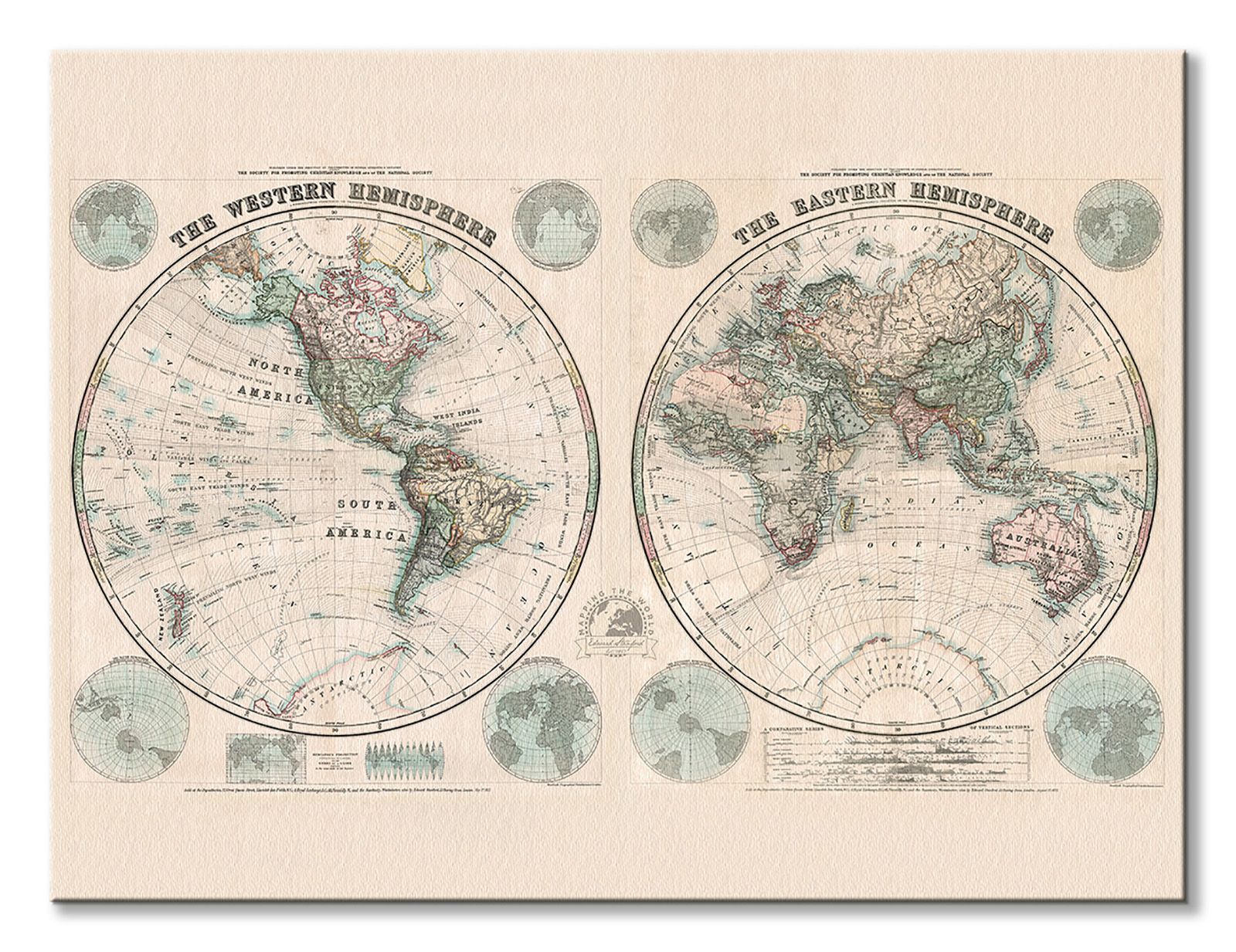 Stanfords Mapa Świata, Półkule 1877 - obraz na płótnie