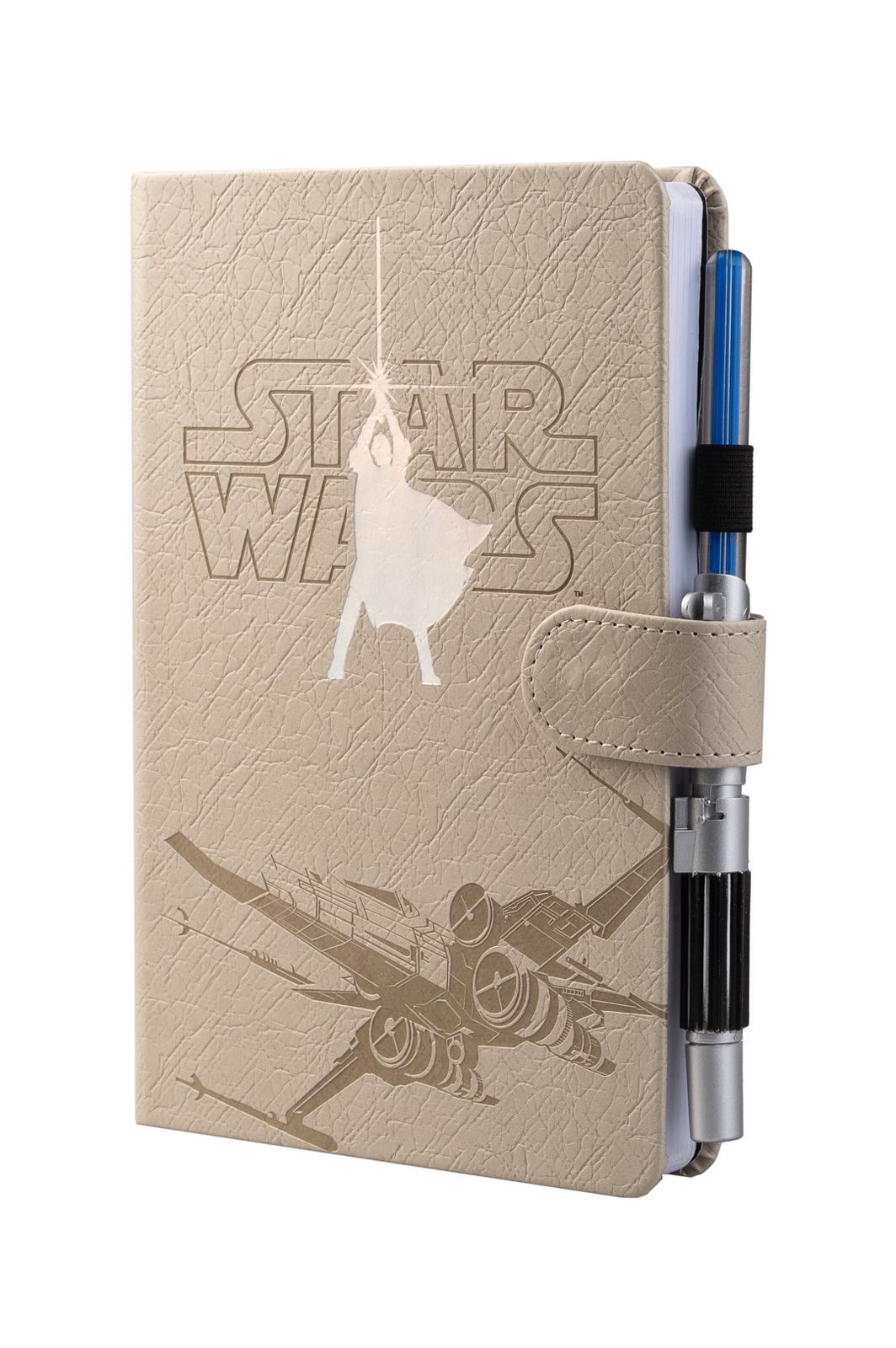 Szczegóły techniczne: Wymiary: A5 Liczba stron: 192 Materiał: Poliuretan Długopis: miecz świetlny z oświetleniem LED, zasilany na 3 baterie 1,5 V AG3 (w zestawie).