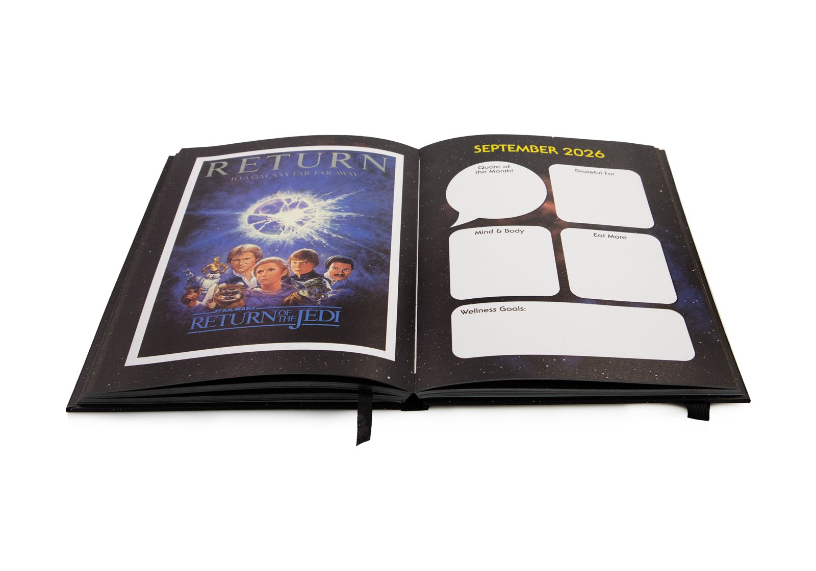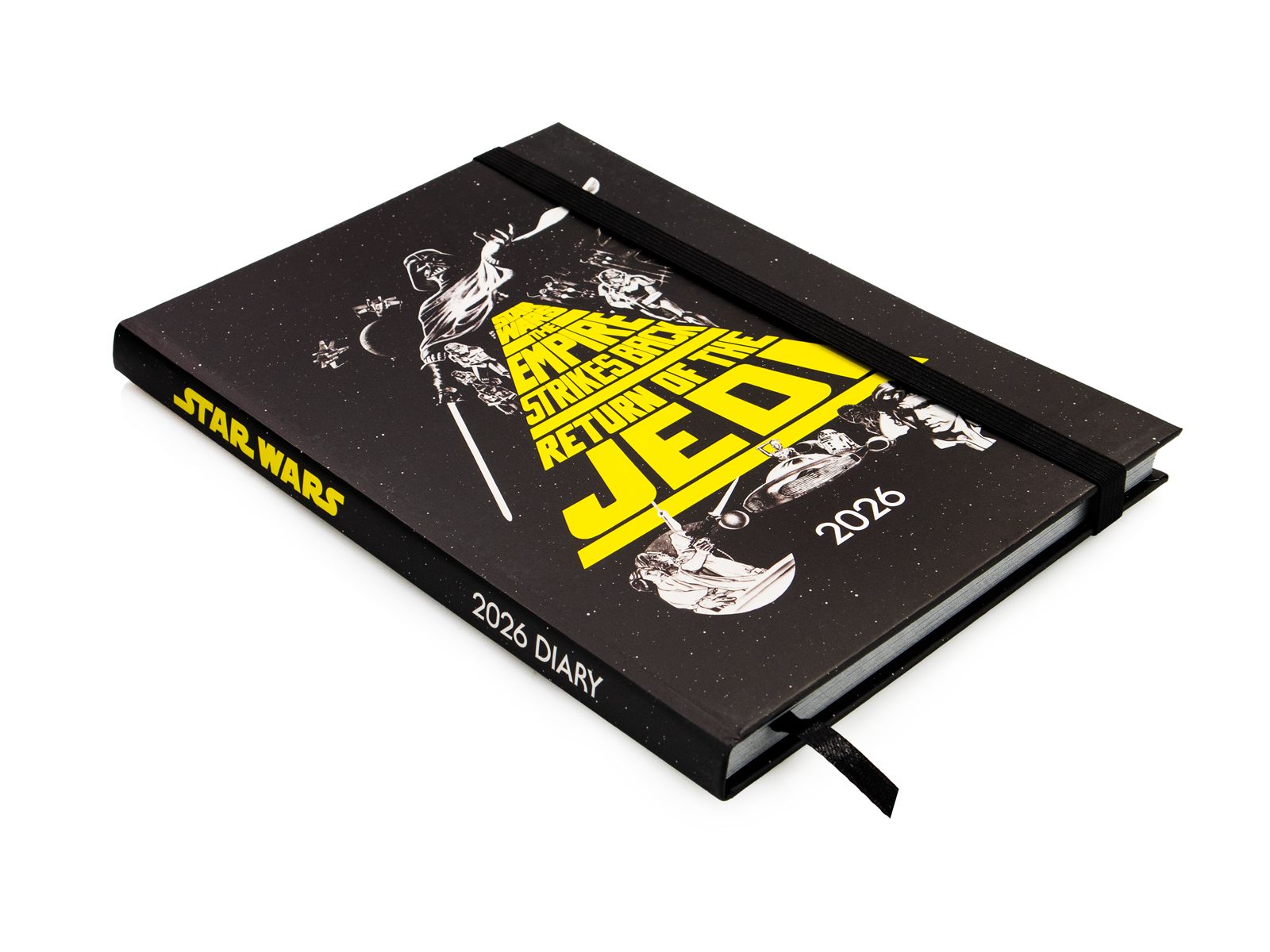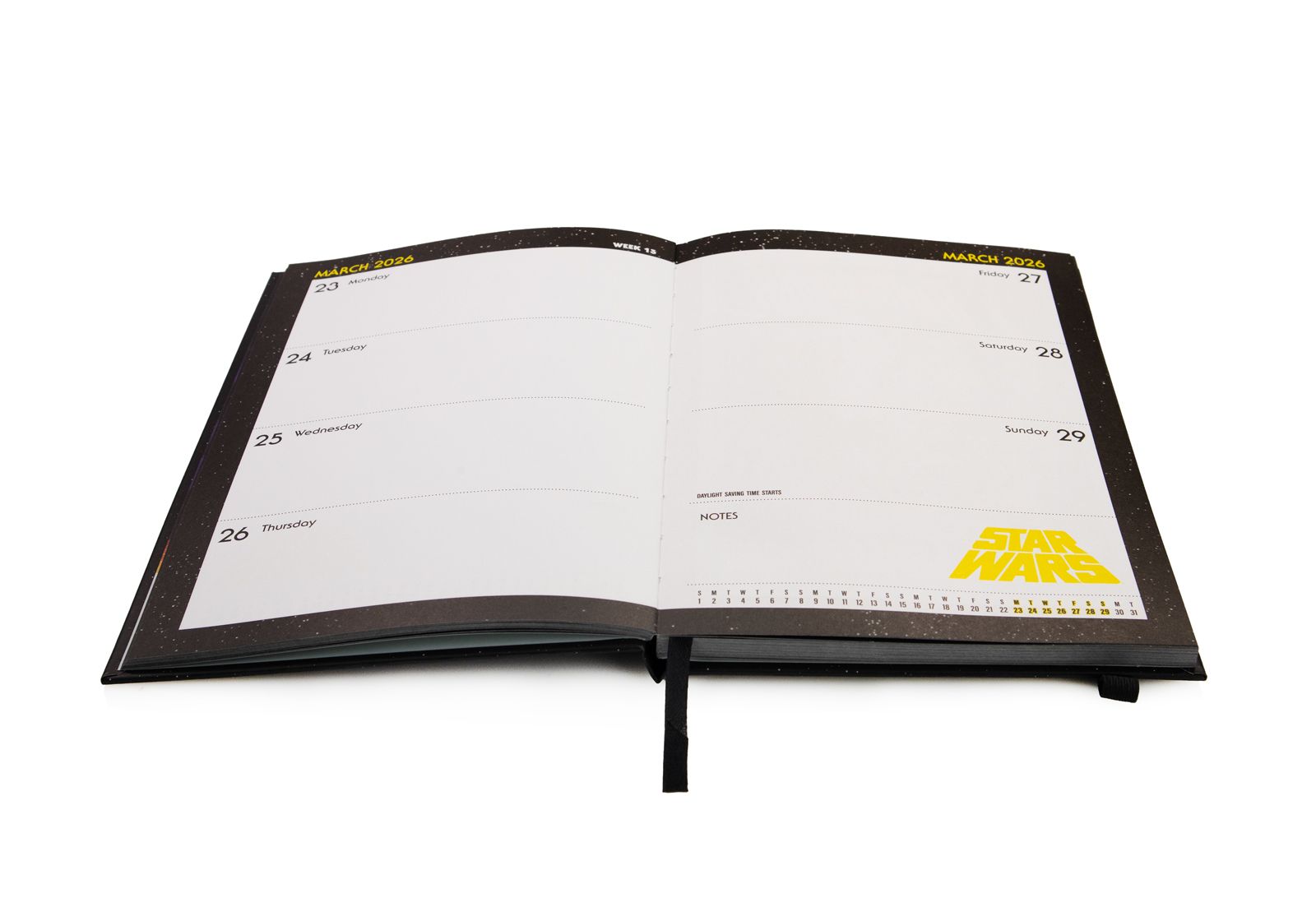 Kalendarz książkowy A5 Star Wars 2026 Twarda oprawa, motywy Lukea, Hana i Lei, tygodniowy układ z miejscem na notatki oraz adresy - idealny organizer dla fanów Gwiezdnych wojen. Papier premium, ekologiczne wykończenie. Szczegóły techniczne: Format: A5 (ok. 15 × 21 cm) Układ: tygodniowy z notatkami i sekcją adresową Ilość stron: 146 Okładka: twarda Papier: wysokiej jakości Opakowanie: eco-friendly (plastic-free) Licencjonowany produkt Autentyczny, oficjalny kalendarz Star Wars.