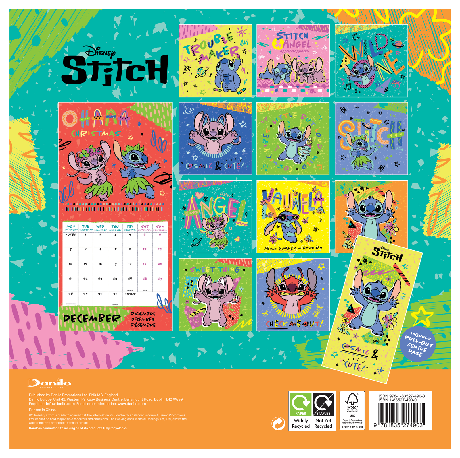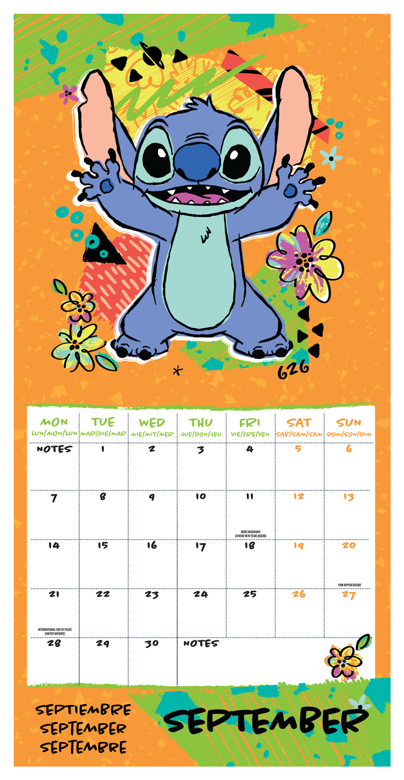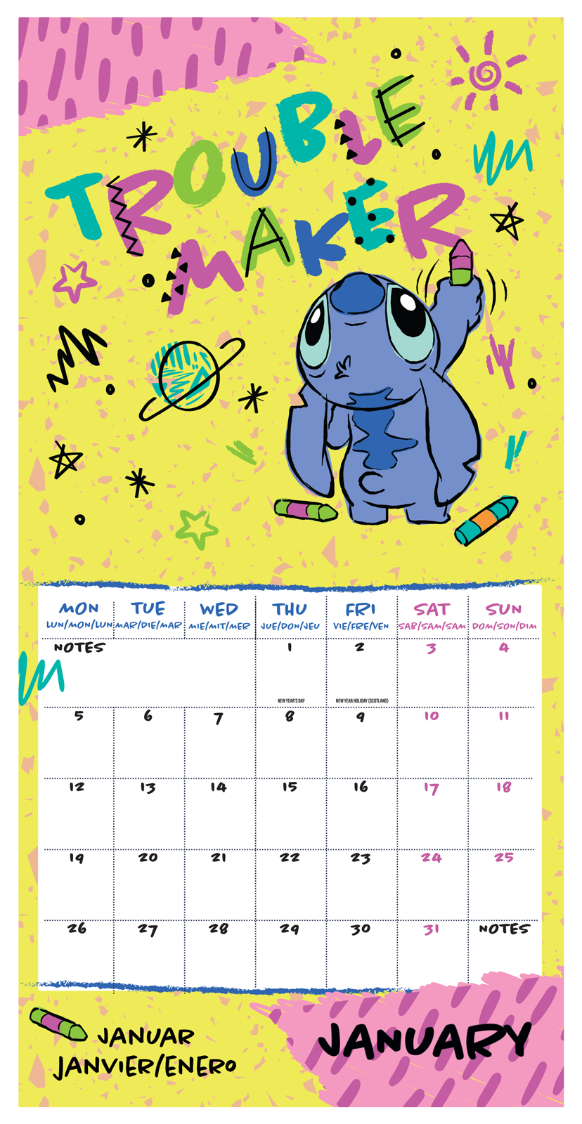 Stitch oficjalny kalendarz na ścianę na 2026rok Oryginalny i licencjonowany kalendarz, posiada 12 rozkładanych stron o wymiarach 30x60 cm. Na każdej z kart znajduje się duża fotografiaoraz czytelne kalendarium z miejscem na notatki. W kalendarzu znajduje się 12 unikalnych zdjęć dla każdego miesiąca. Okładki wykonane są z papieru powlekanego matowego i laminowanego o gramaturze 250 g/m?, wnętrze z papieru powlekanego matowego o gramaturze 150 g/m?. Nagłówki są wjęzykach: angielskim, francuskim, hiszpańskim i niemieckim. Oprawa zszywkowa. Złożony kalendarz 30x30 cm. Rozłożony kalendarz 30x60 cm. Zawiera otwór 5 mm do zawieszenia na ścianie.