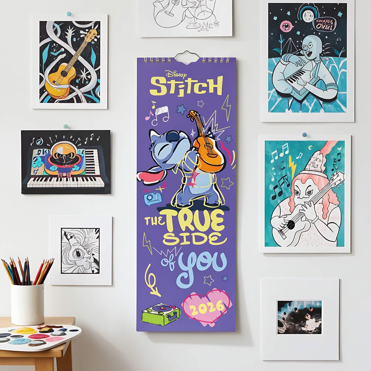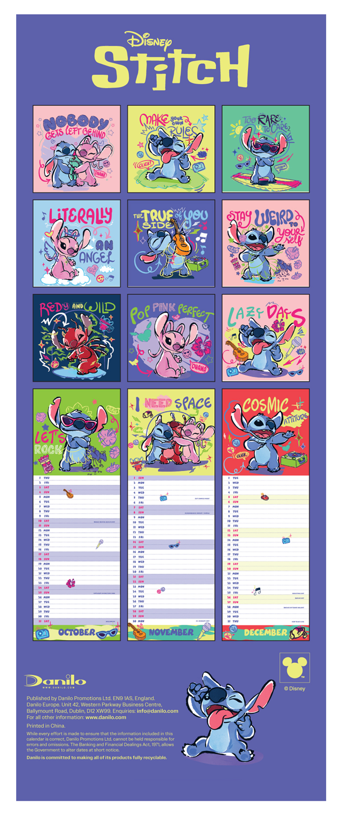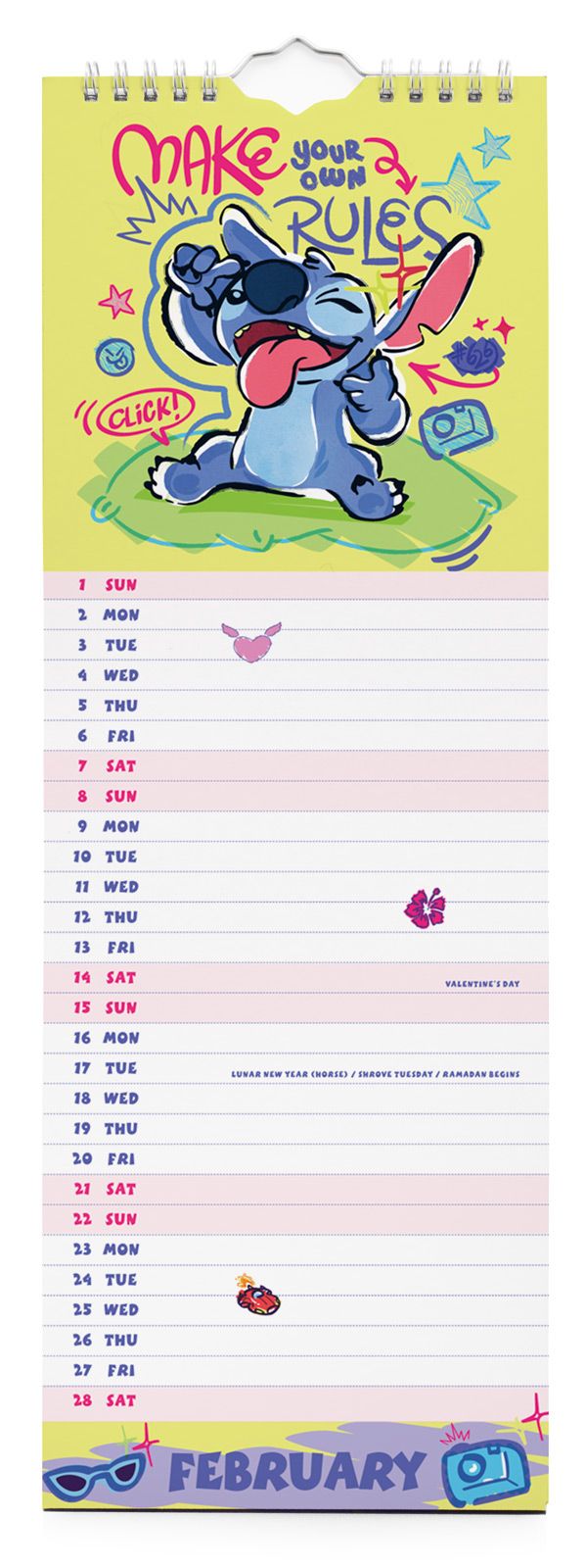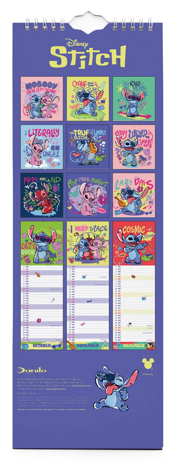 Stitch oficjalny kalendarz na ścianę na 2026 rok w wersji slim Oryginalny i licencjonowany kalendarz, posiada 12 rozkładanych stron o wymiarach 14x42 cm. Na każdej z kart znajduje się urocza ilustracja Stitcha oraz czytelne kalendarium z miejscem na notatki. W kalendarzu znajduje się 12 unikalnych grafik z bohaterem Disneya, które wniosą odrobinę magii do codzienności. Okładki i wnętrze wykonane są z wysokiej jakości papieru w wersji ekologicznej, wolnej od plastiku. Nagłówki są w języku angielskim. Oprawa zszywkowa. Format slim 14x42 cm. 12 miesięcznych stron + okładka. Zawiera otwór 5 mm do zawieszenia na ścianie.