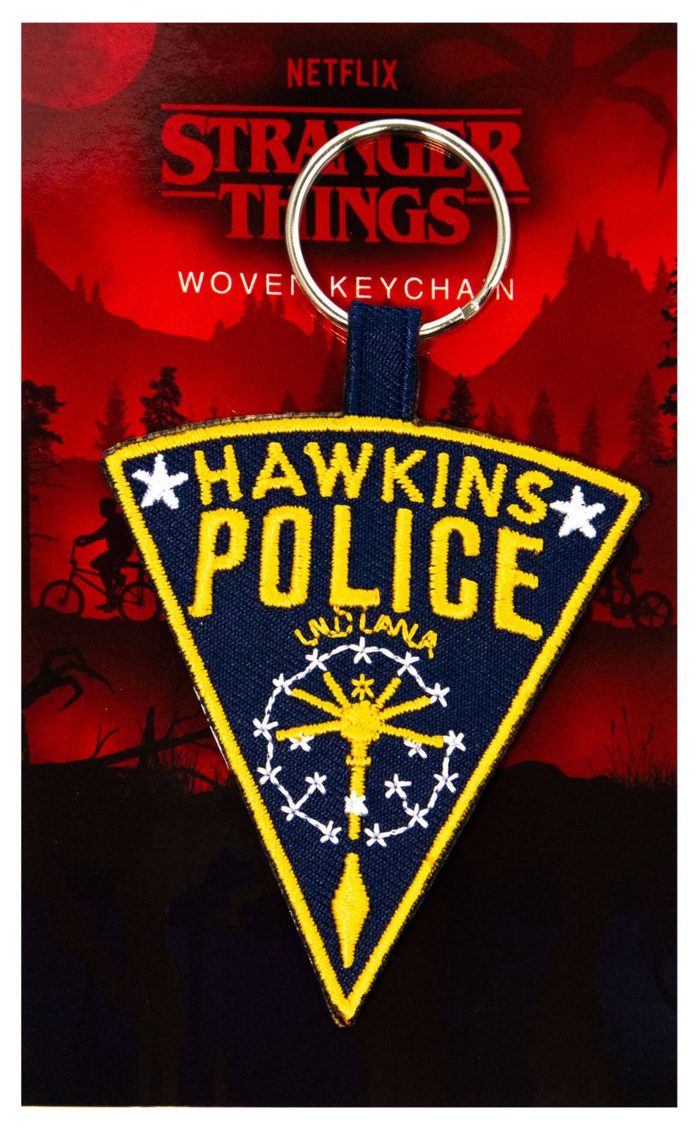 Tkany brelok Stranger Things Hawkins Police Tkany brelokdo kluczy z popularnym motywem. Kompletny brelok składa się zmetalowegooczka oraz tkanej zawieszki. Brelok to idealny upominek w konkursach i zabawach. To oryginalnyilicencjonowanygadżet! Przedstawiony brelok ma rozmiar ok. 4,5x6cm.