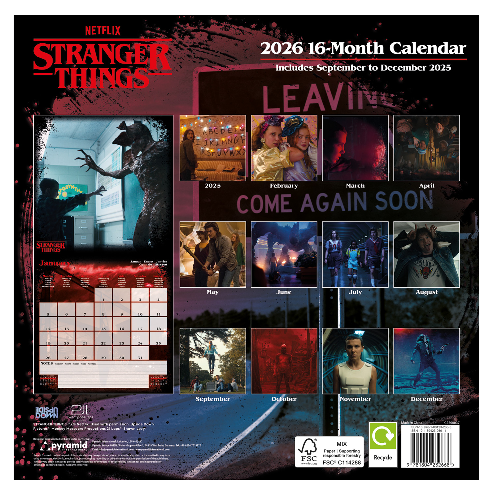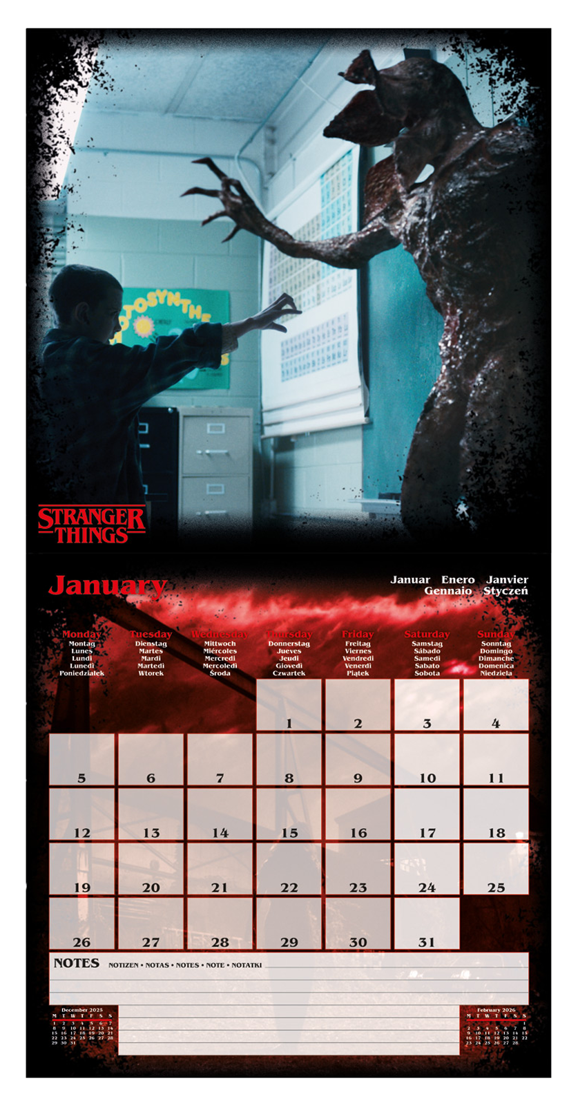 Stranger Things oficjalny kalendarz na ścianę na 2026rok Oryginalny i licencjonowany kalendarz, posiada 12 rozkładanych stron o wymiarach 30x60 cm. Na każdej z kart znajduje się duża fotografiaoraz czytelne kalendarium z miejscem na notatki. W kalendarzu znajduje się 12 unikalnych zdjęć dla każdego miesiąca. Okładki wykonane są z papieru powlekanego matowego i laminowanego o gramaturze 250 g/m?, wnętrze z papieru powlekanego matowego o gramaturze 150 g/m?. Nagłówki są w języku angielskim. Oprawa zszywkowa. Złożony kalendarz 30x30 cm. Rozłożony kalendarz 30x60 cm. Zawiera otwór 5 mm do zawieszenia na ścianie.