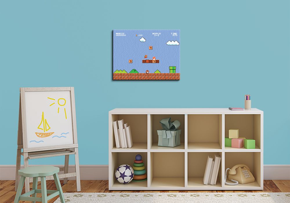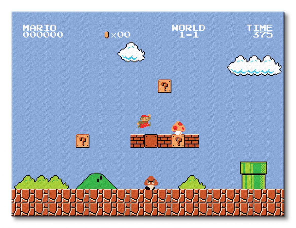 Obraz na ścianę noszący nazwę Super Mario Bros. (1-1). Autorstwa: nieznany Szukasz oryginalnego obrazu na ścianę? Wybierz jeden z naszej kolekcji! wyraziste barwy i doskonała ostrość nadruku., obrazy charakteryzuje wysokie nasycenie barw i ostrość, nie sposób oderwać od nich wzrok. Dzięki wykorzystaniu nowych technologii obraz jest piękny i zachowuje swój wygląd przez długi czas. Bawełniane płótno wysokiej jakości gwarantuje świetne odwzorowanie i trwałość obrazu.