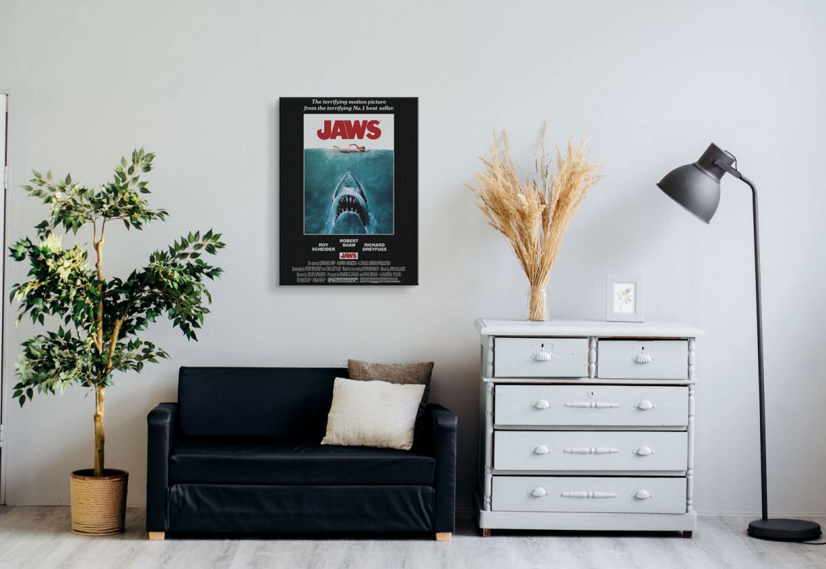 Obraz na ścianę noszący nazwę JAWS (ONE SHEET). Szukasz oryginalnej, ekskluzywnej dekoracji na ścianę? Ten obraz jest dla Ciebie! trwałe kolory i fantastyczna jakość., obrazy charakteryzuje wysokie nasycenie barw i ostrość, nie sposób oderwać od nich wzrok. Kolory utrzymują się przez długie lata. Doskonałej jakości płótno to gwarancja naturalnego wyglądu i trwałości obrazu.