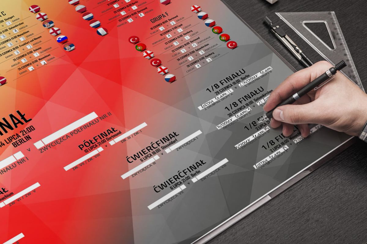 Tabela Euro 2024 terminarz rozgrywek na plakacie Plakat z tabelą rozgrywek wszystkich 51 meczy na EURO 2024, które odbędzie się w Niemczech. Pierwszy mecz rozegra się 14 czerwca na Stadionie Allianz Arena w Monachium. Reprezentacja Polski ma przed sobą 3 mecze w grupie D: Polska – Holandia, 16 czerwca o 15:00 Polska – Austria, 21 czerwca o 18:00 Polska – Francja, 25 czerwca o 18:00
