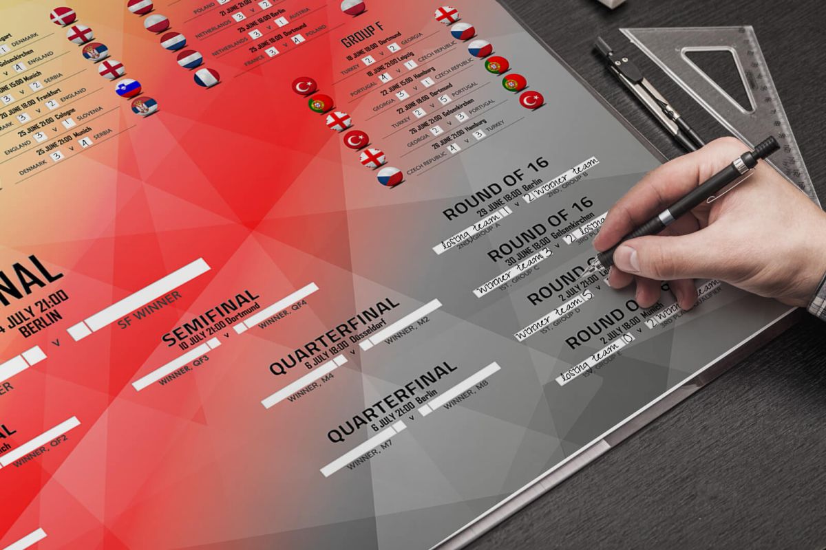 Tabela Euro 2024 terminarz rozgrywek na plakacie Plakat z tabelą rozgrywek wszystkich 51 meczy na EURO 2024, które odbędzie się w Niemczech. Pierwszy mecz rozegra się 14 czerwca na Stadionie Allianz Arena w Monachium. Reprezentacja Polski ma przed sobą 3 mecze w grupie D: Polska – Holandia, 16 czerwca o 15:00 Polska – Austria, 21 czerwca o 18:00 Polska – Francja, 25 czerwca o 18:00