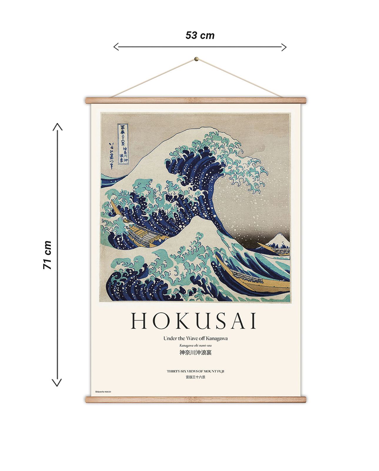 Banner dekoracyjny The Great Wave Off Kanagawa Hokusai Dodaj nutę klasycznej japońskiej sztuki do swojego wnętrza z banerem dekoracyjnym "The Great Wave Off Kanagawa" autorstwa Hokusaia. Baner o wymiarach 71 x 53 x 1,7 cm, wykonany z jedwabistej tkaniny, prezentuje się wyjątkowo elegancko. Drewniane wykończenia na górze i dole nadają mu solidności, a sznurek umożliwia łatwe zawieszenie.