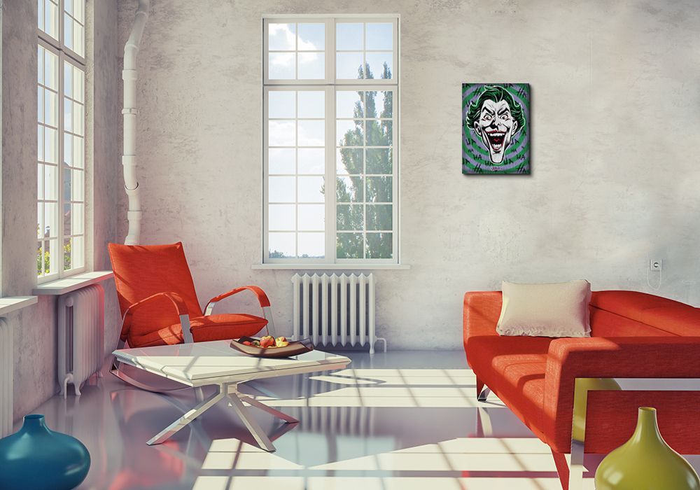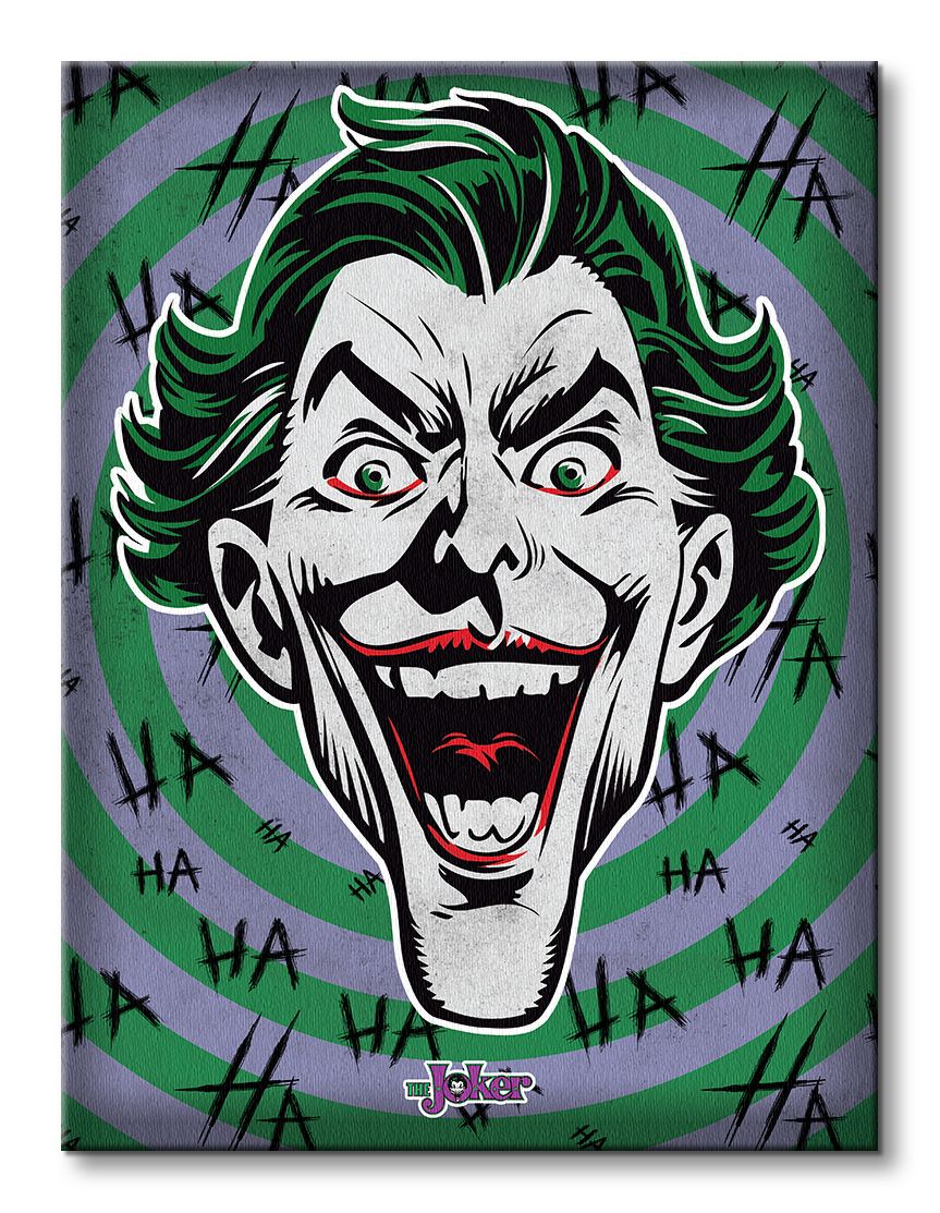 Obraz na ścianę noszący nazwę The Joker (Hahaha). Autorstwa: nieznany Szukasz oryginalnego obrazu na ścianę? Wybierz jeden z naszej kolekcji! nasycone kolory i doskonała jakość., obrazy charakteryzuje wysokie nasycenie barw i ostrość, nie sposób oderwać od nich wzrok. Dzięki wykorzystaniu nowych technologii obraz jest piękny i zachowuje swój wygląd przez długi czas. Bawełniane płótno wysokiej jakości gwarantuje świetne odwzorowanie i trwałość obrazu.