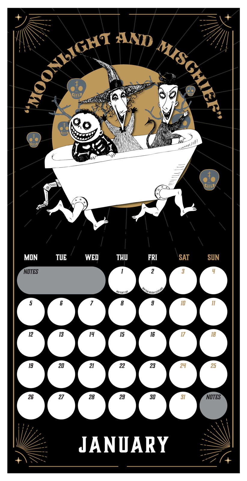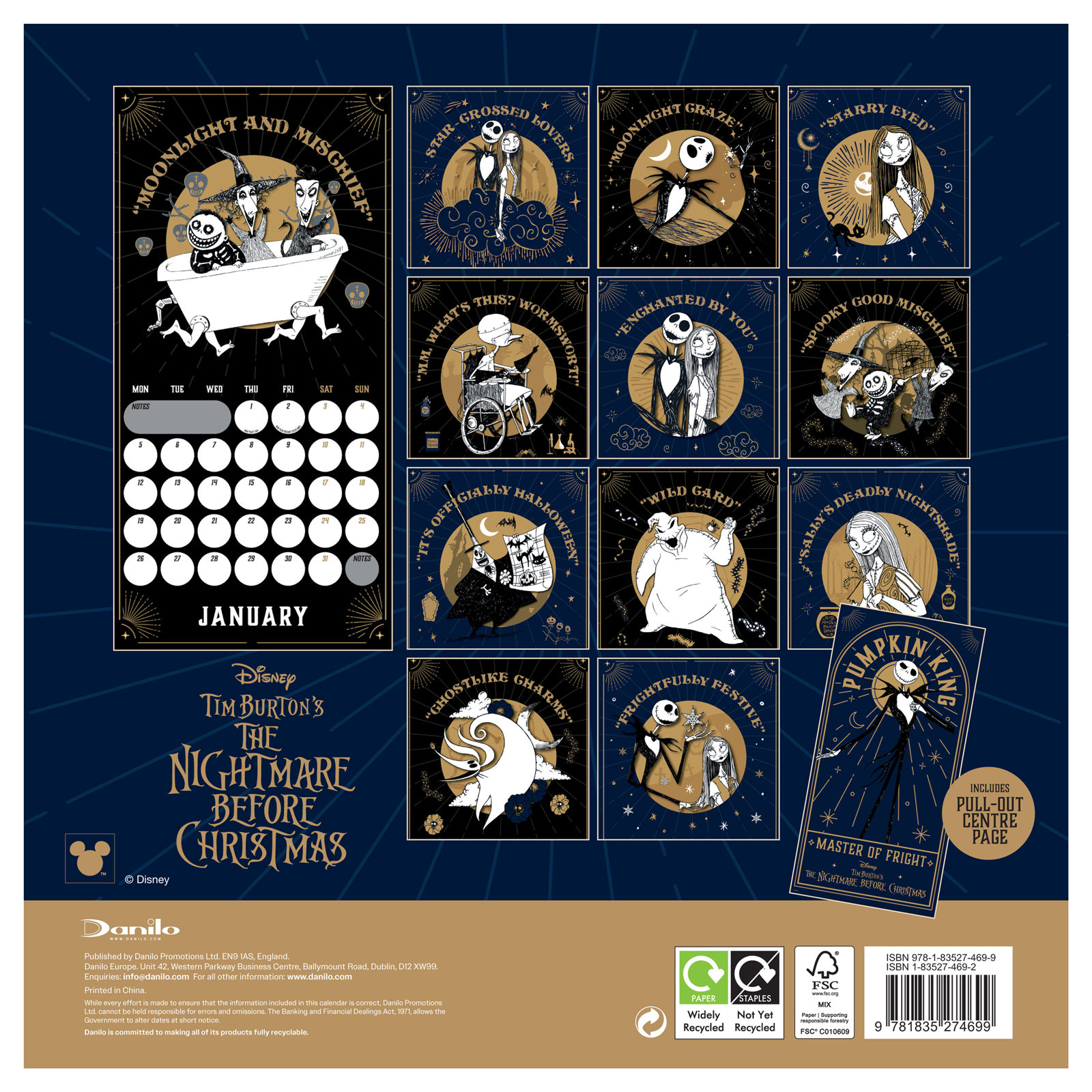 The Nightmare Before Christmas oficjalny kalendarz na ścianę na 2026rok Oryginalny i licencjonowany kalendarz, posiada 12 rozkładanych stron o wymiarach 30x60 cm. Na każdej z kart znajduje się duża fotografiaoraz czytelne kalendarium z miejscem na notatki. W kalendarzu znajduje się 12 unikalnych zdjęć dla każdego miesiąca. Okładki wykonane są z papieru powlekanego matowego i laminowanego o gramaturze 250 g/m?, wnętrze z papieru powlekanego matowego o gramaturze 150 g/m?. Nagłówki są w języku angielskim. Oprawa zszywkowa. Złożony kalendarz 30x30 cm. Rozłożony kalendarz 30x60 cm. Zawiera otwór 5 mm do zawieszenia na ścianie.