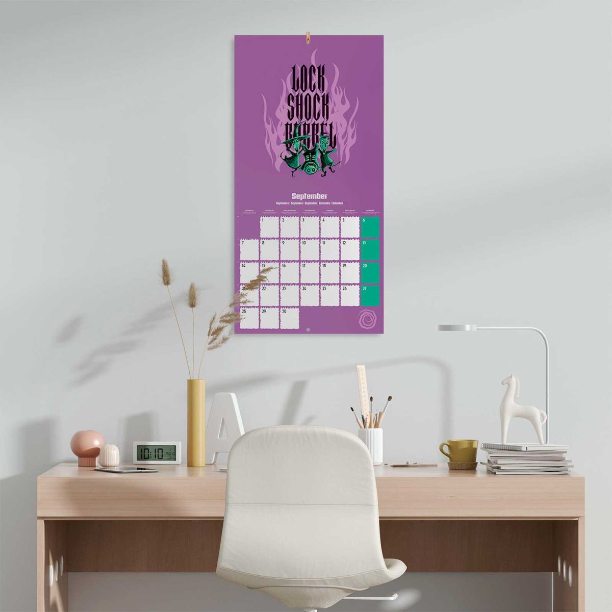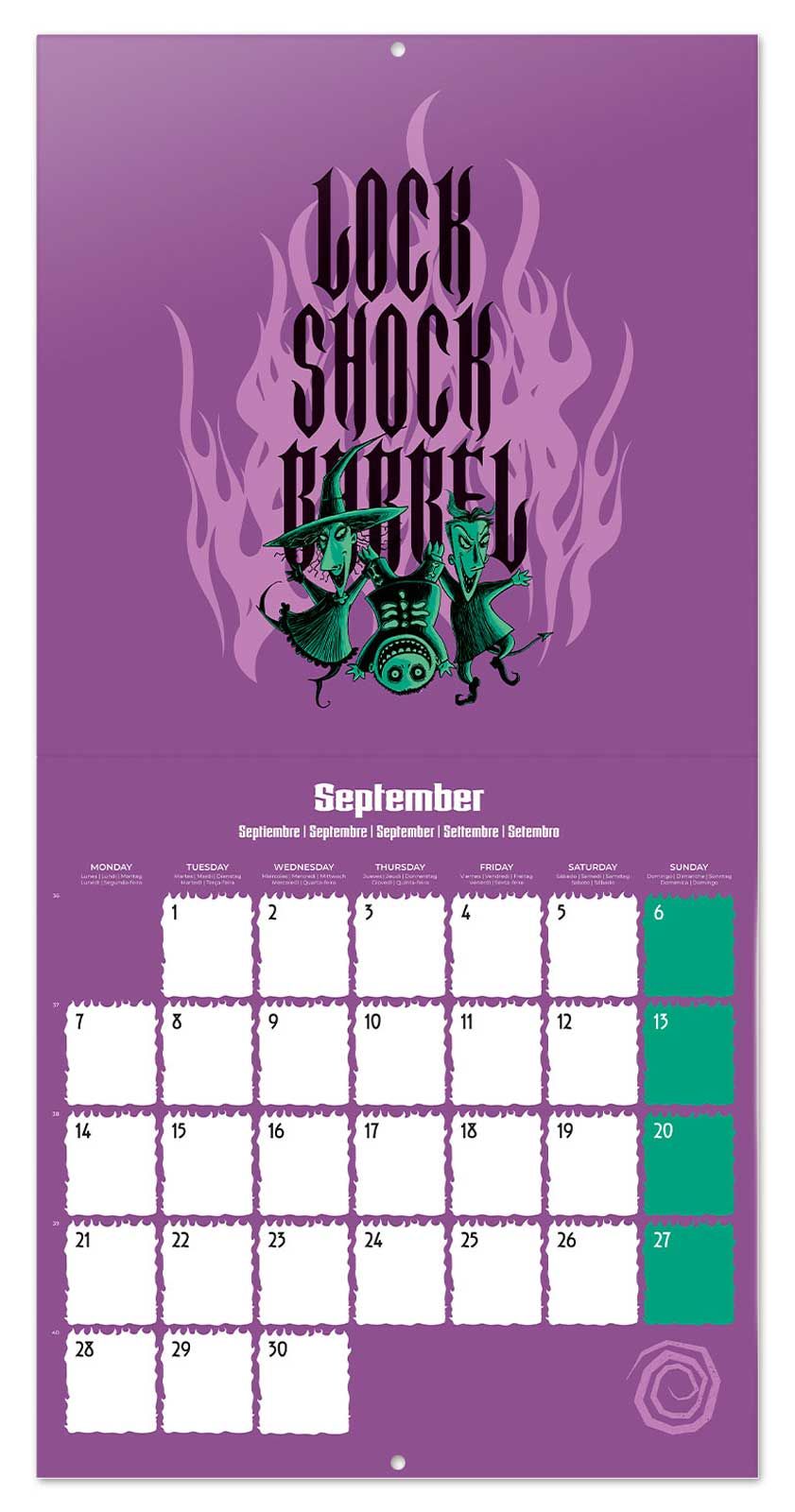 Disney The Nightmare Before Christmas oficjalny kalendarz na ścianę na 2026rok Oryginalny i licencjonowany kalendarz, posiada 12 rozkładanych stron o wymiarach 30x60 cm. Na każdej z kart znajduje się duża fotografiaoraz czytelne kalendarium z miejscem na notatki. W kalendarzu znajduje się 12 unikalnych zdjęć dla każdego miesiąca + plakat. Okładki wykonane są z papieru powlekanego matowego i laminowanego o gramaturze 250 g/m2, wnętrze z papieru powlekanego matowego o gramaturze 150 g/m2. Nagłówki są w 6 językach:angielski, hiszpański, francuski, włoski, niemiecki i portugalski. Oprawa zszywkowa. Złożony kalendarz 30x30 cm. Rozłożony kalendarz 30x60 cm. Zawiera otwór 5 mm do zawieszenia na ścianie.