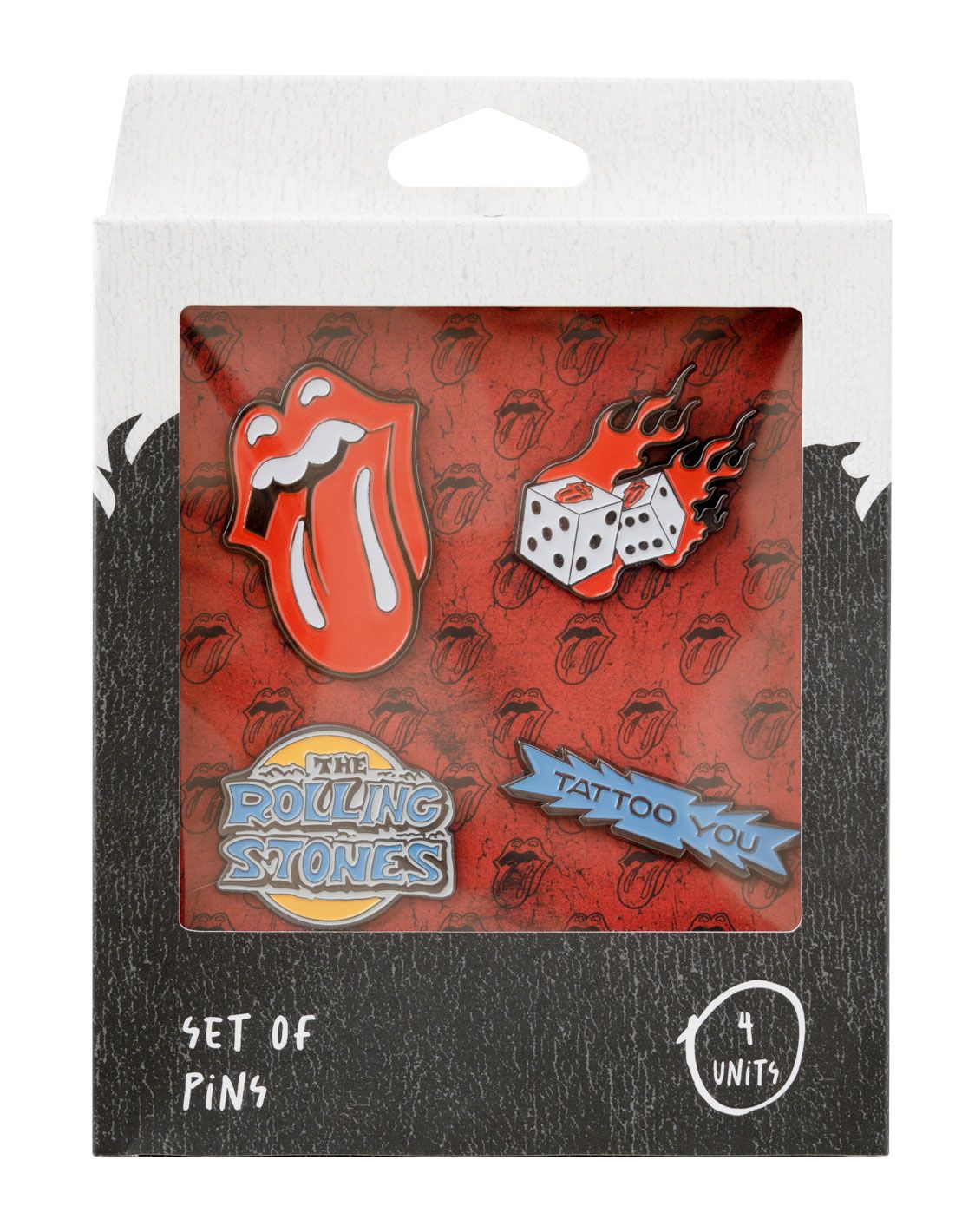 Rolling Stones - zestaw 4 przypinek Przypinki inspirowane zespołem The Rolling Stones to wyjątkowy gadżet dla miłośników muzyki rockowej. Wykonane z trwałego stopu cynku i ozdobione emalią, prezentują kultowe motywy zespołu. Doskonały dodatek do ubrań lub plecaków, zapakowany w pudełko z okienkiem. Szczegóły techniczne: Wymiary: od 2,5 do 4 cm Materiał: Stop cynku, emaliowane Opakowanie: Pudełko ochronne z okienkiem Licencjonowany produkt Oryginalny produkt The Rolling Stones, idealny dla fanów legendarnej grupy muzycznej.
