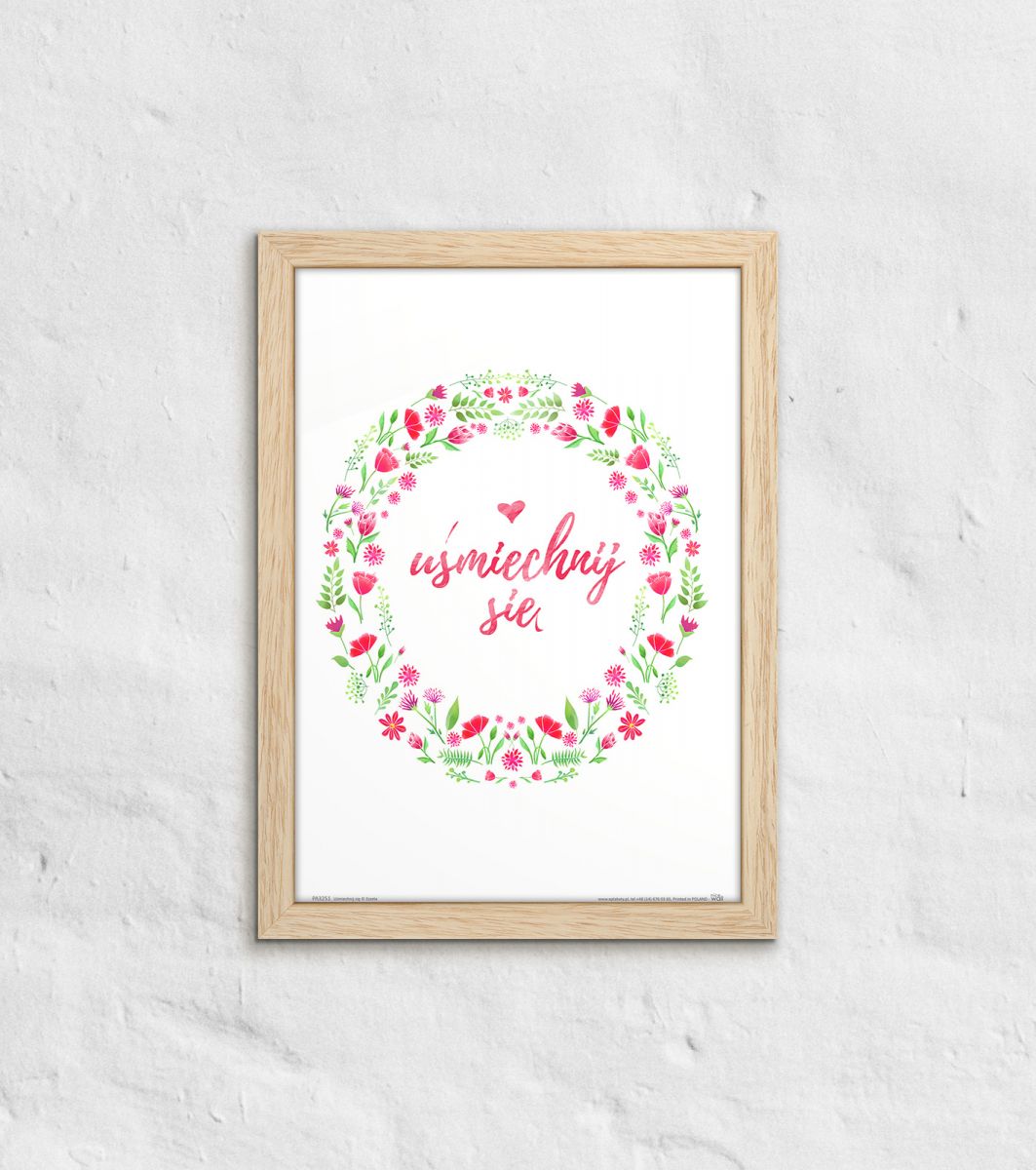 Plakat na ścianę, zatytułowany Uśmiechnij się Ciekawy i oryginalny plakat na ścianę. Wyprodukowany na papierze o wysokiej gramaturze w cyfrowej jakości. Plakat wykonany przez polskiego producenta. Świetnie nadaje się do oprawienia w ramy lub antyramy. Specyfikacja papier satynowy 220g/m2 druk cyfrowy wymiary plakatu 21x29,7 cm