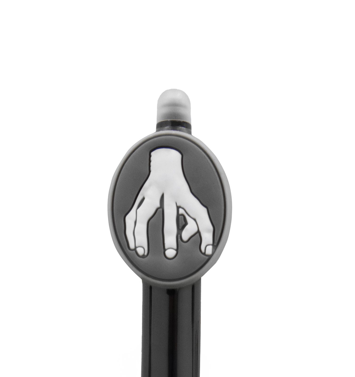 Długopis zmywalny Wednesday Hand Długopis z grafiką Rączki z serialu Wednesday. Z niebieskim wkładem, gumką i wygodnym klikanym mechanizmem. Świetnie sprawdzi się w szkole lub biurze. Szczegóły techniczne Kolor tuszu: niebieski Końcówka: gumka Mechanizm: klik Motyw: Rączka Licencjonowany produkt z oficjalnej kolekcji Wednesday.