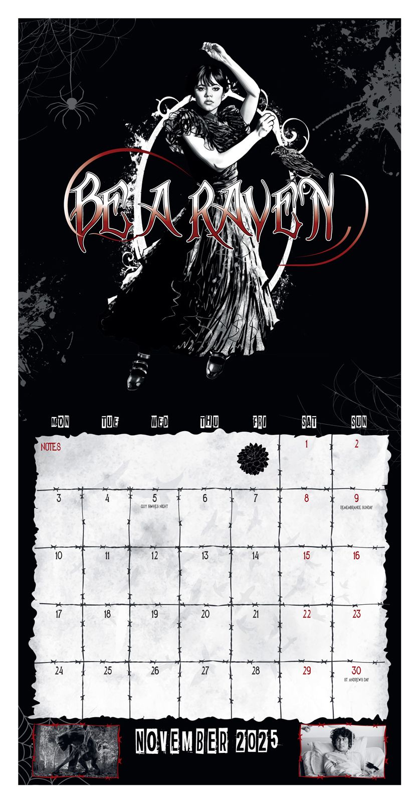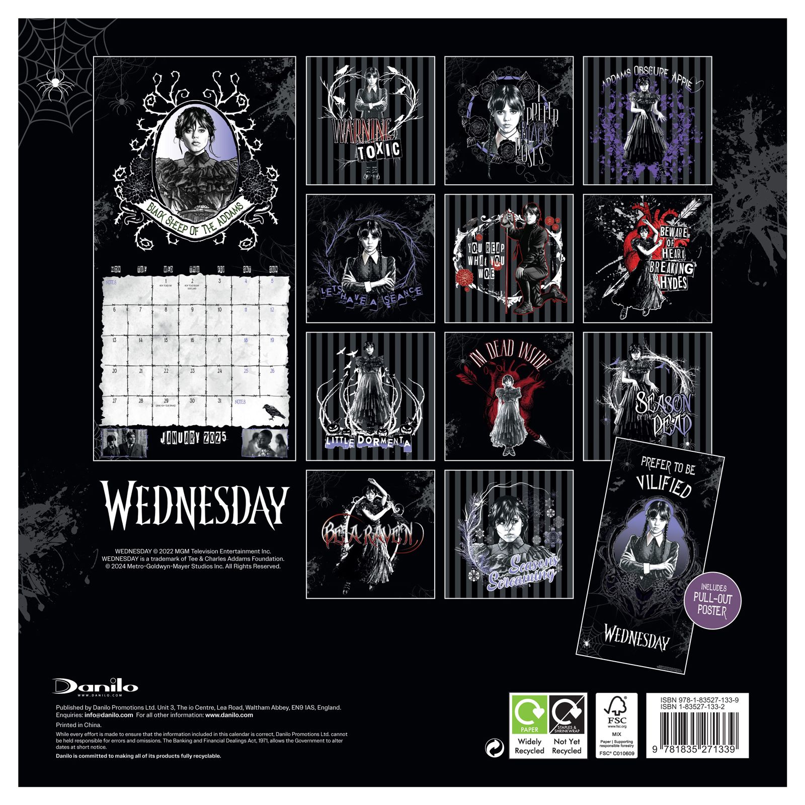 Wednesday oficjalny kalendarz na ścianę na 2025rok Oryginalny i licencjonowany kalendarz, posiada 12 rozkładanych stron o wymiarach 30x60 cm. Na każdej z kart znajduje się duża fotografiaoraz czytelne kalendarium z miejscem na notatki. Okładki wykonane są z papieru powlekanego matowego i laminowanego o gramaturze 250 g/m2, wnętrze z papieru powlekanego matowego o gramaturze 150 g/m2. Nagłówki są w języku angielskim. Oprawa zszywkowa. Złożony kalendarz 30x30 cm. Rozłożony kalendarz 30x60 cm. Zawiera otwór 5 mm do zawieszenia na ścianie.
