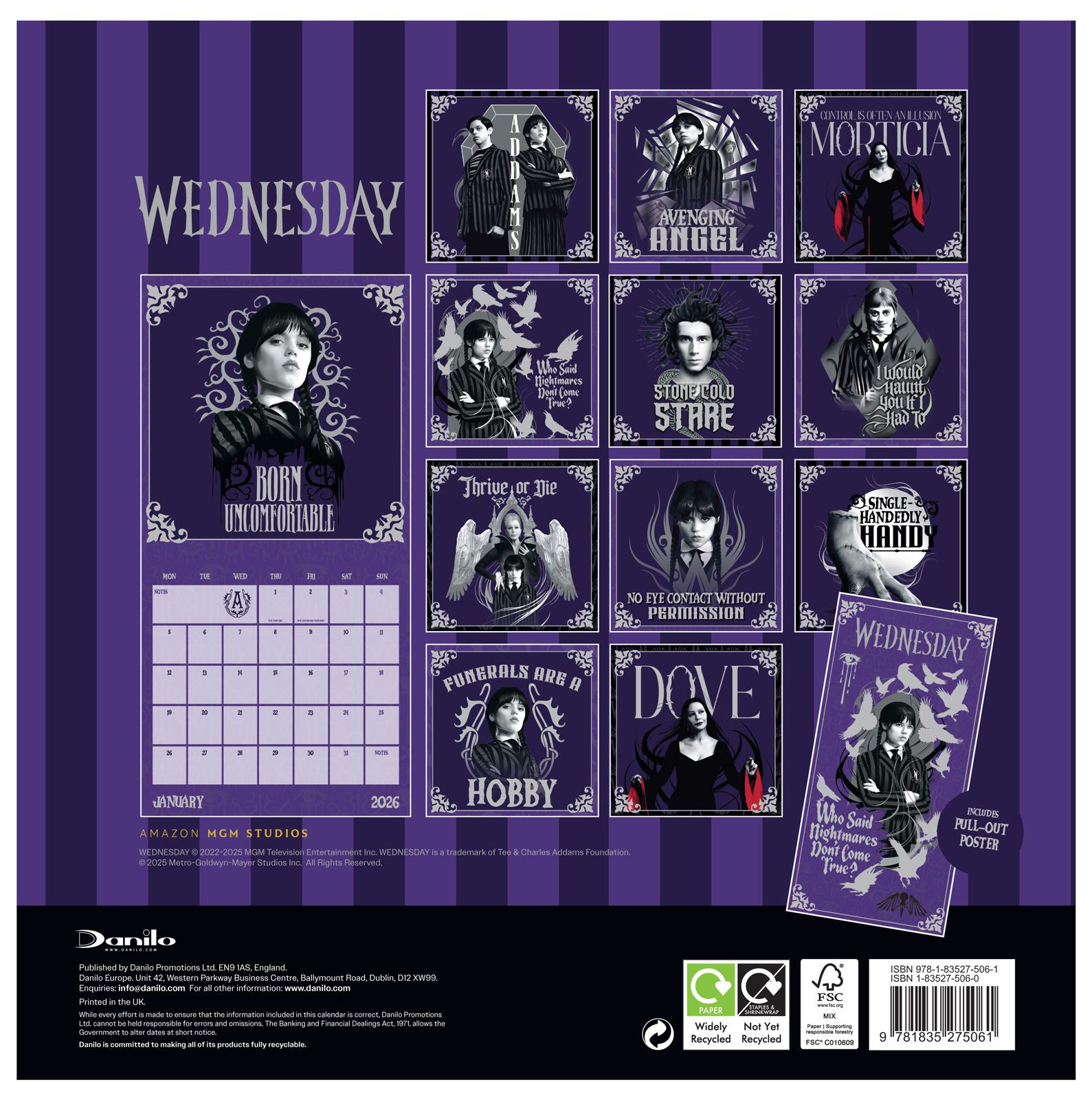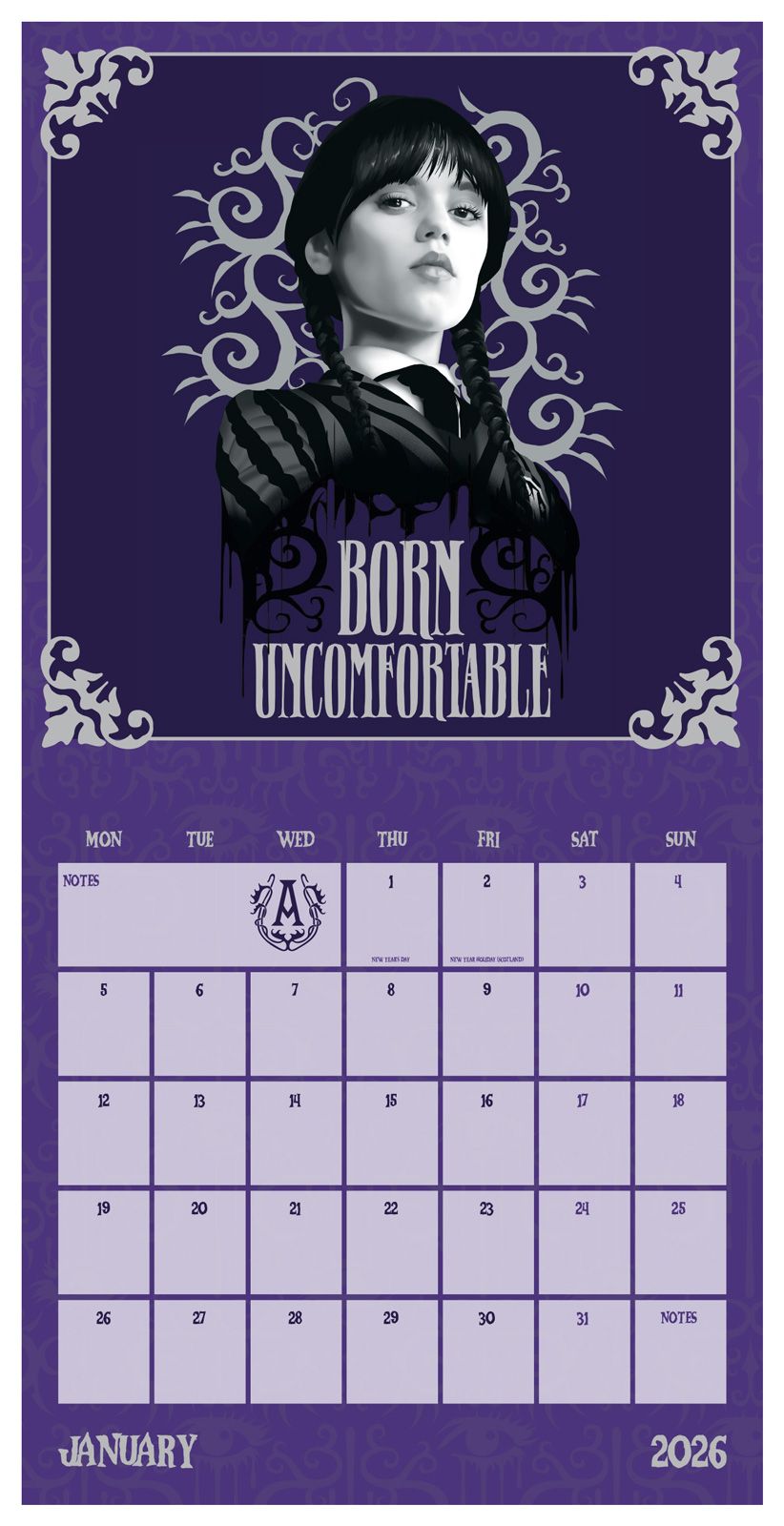 Wednesday oficjalny kalendarz na ścianę na 2026rok Oryginalny i licencjonowany kalendarz, posiada 12 rozkładanych stron o wymiarach 30x60 cm. Na każdej z kart znajduje się duża fotografiaoraz czytelne kalendarium z miejscem na notatki. W kalendarzu znajduje się 12 unikalnych zdjęć dla każdego miesiąca + plakat. Okładki wykonane są z papieru powlekanego matowego i laminowanego o gramaturze 250 g/m?, wnętrze z papieru powlekanego matowego o gramaturze 150 g/m?. Nagłówki są w języku angielskim. Oprawa zszywkowa. Złożony kalendarz 30x30 cm. Rozłożony kalendarz 30x60 cm. Zawiera otwór 5 mm do zawieszenia na ścianie.
